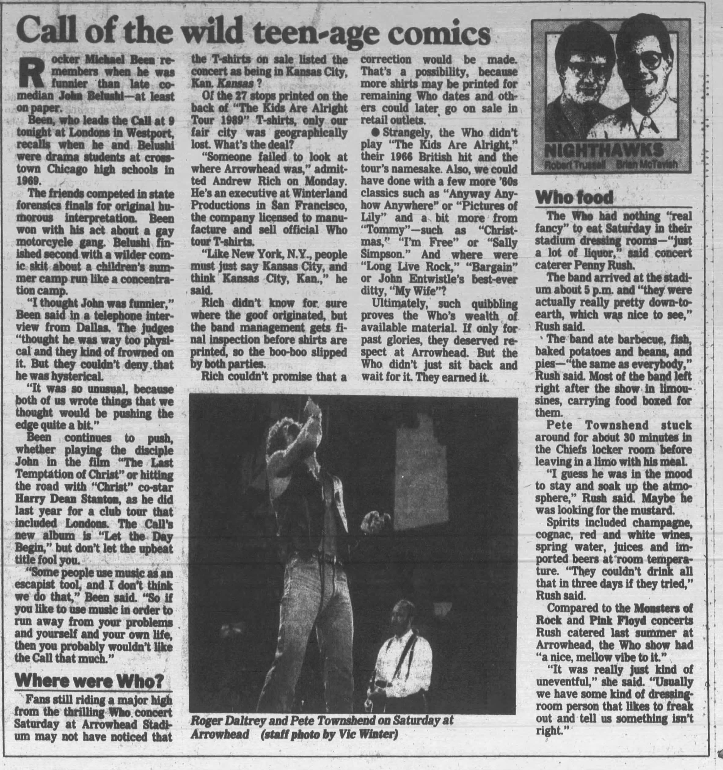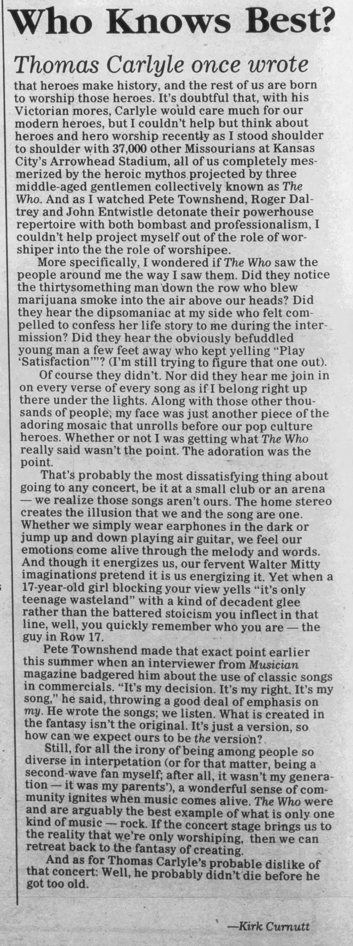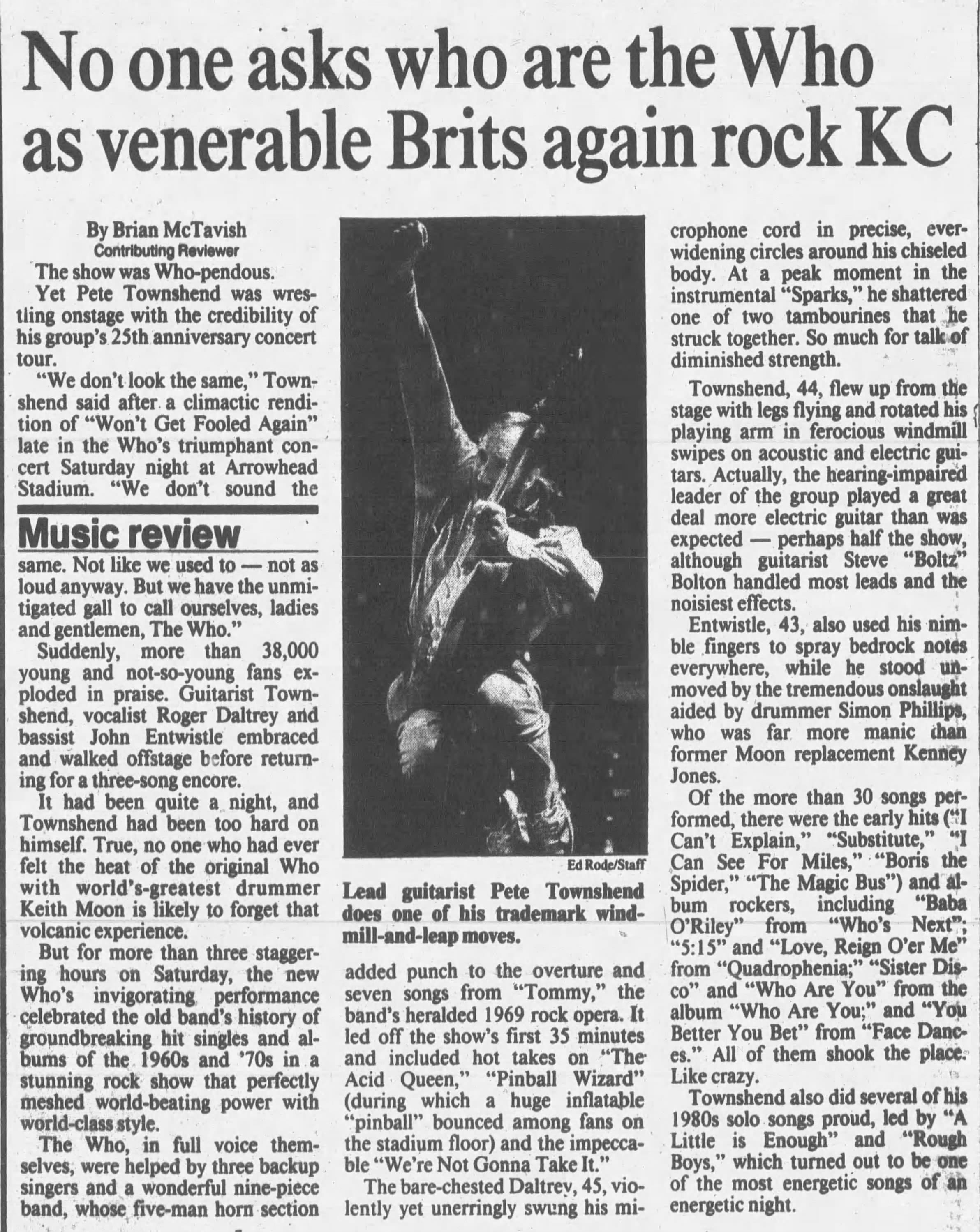 Saturday, August 5th, 1989 The Who play Arrowhead Stadium in Kansas City, Missouri « 1989-07-30 1989-08-07 » WhoTube Newspapers 1989-08-07-The_Kansas_City_Times 1989-08-08-The_Kansas_City_Star 1989-08-13-Columbia_Missourian Comments Leave a Reply Cancel replyYou must be logged in to post a comment. This site uses Akismet to reduce spam. Learn how your comment data is processed. Map Venue Arrowhead Stadium, Kansas City I was there Latitude: 39.048931 Longitude: -94.483984 For more information on The Who’s history and concerts visit our friends www.thewhothismonth.com www.thewholive.com