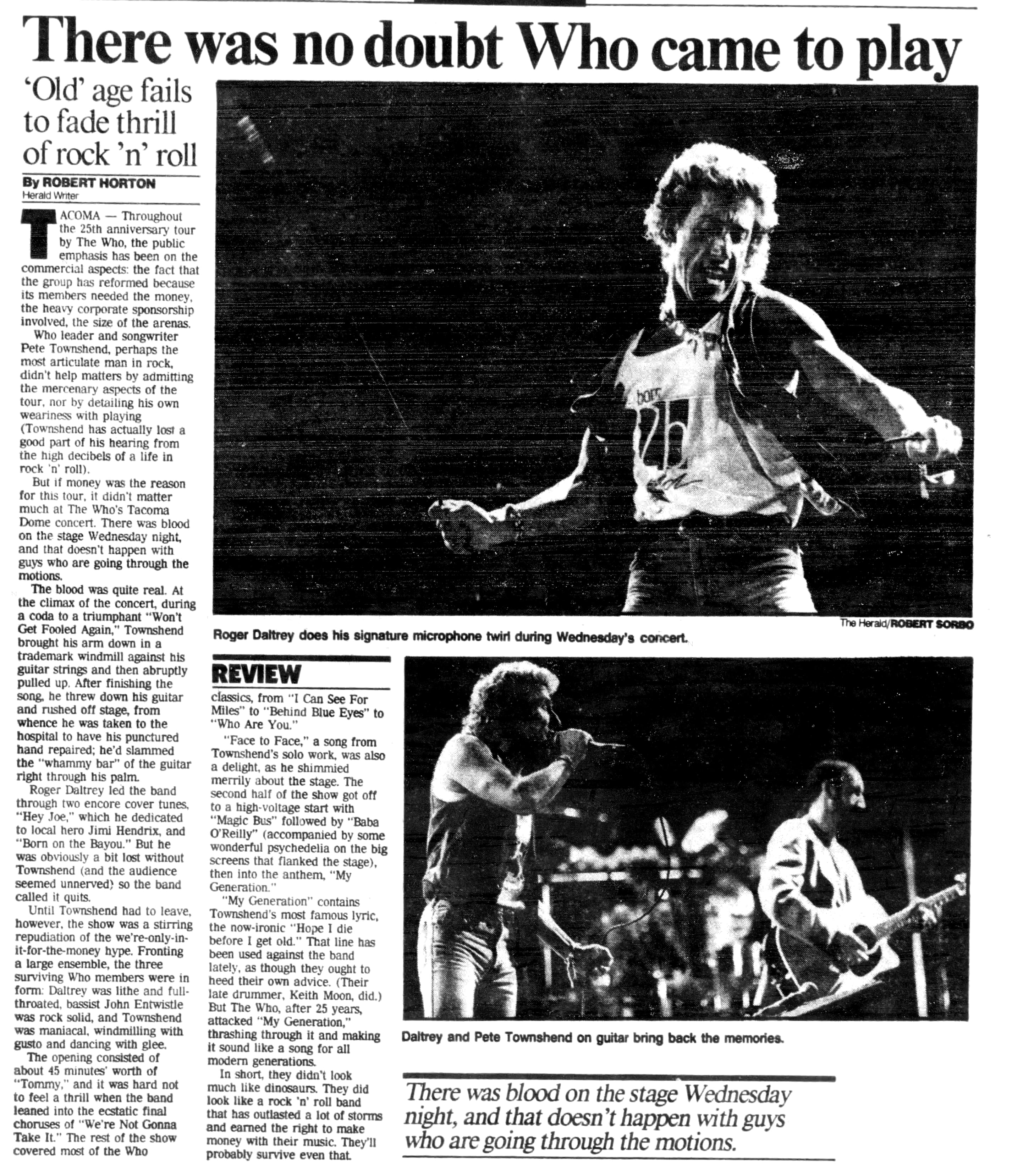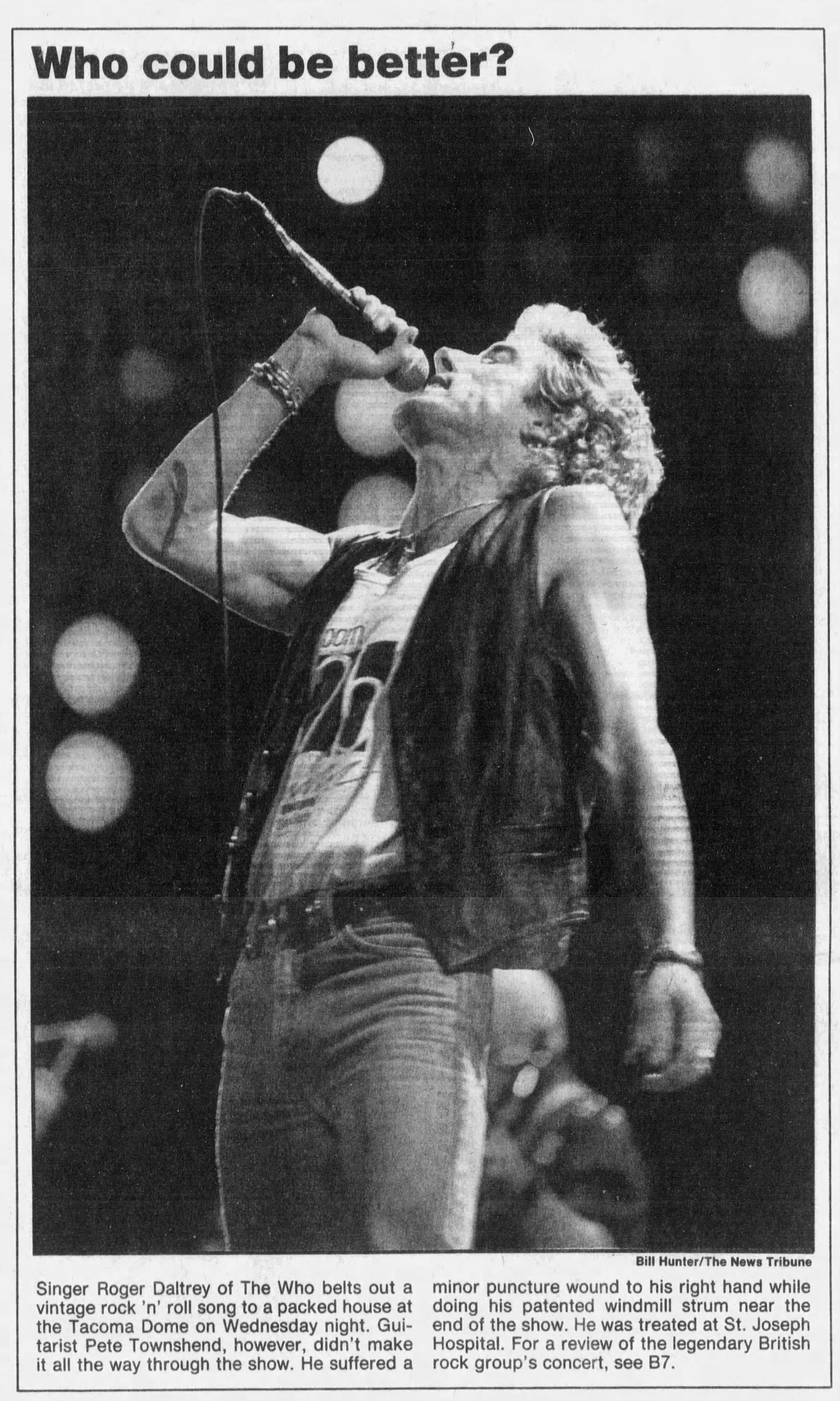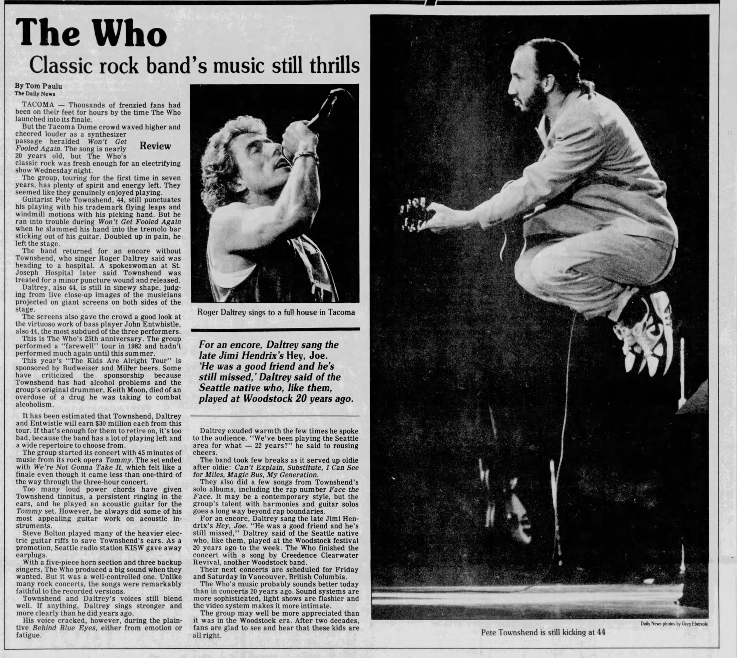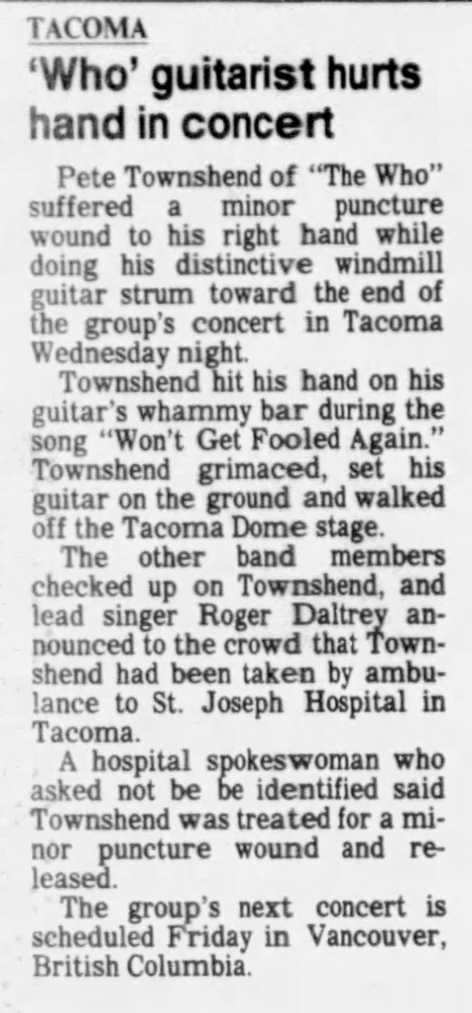 The Who play the Tacoma Dome in Tacoma, Washington. A loose tremolo bar impales Pete's hand in mid-windmill during the conclusion of "Won't Get Fooled Again", driving the bar through the webbing between the fourth and fifth fingers. He is rushed to hospital where he gets stitched up. The rest of the band continues with the encore absent their pierced axeman.