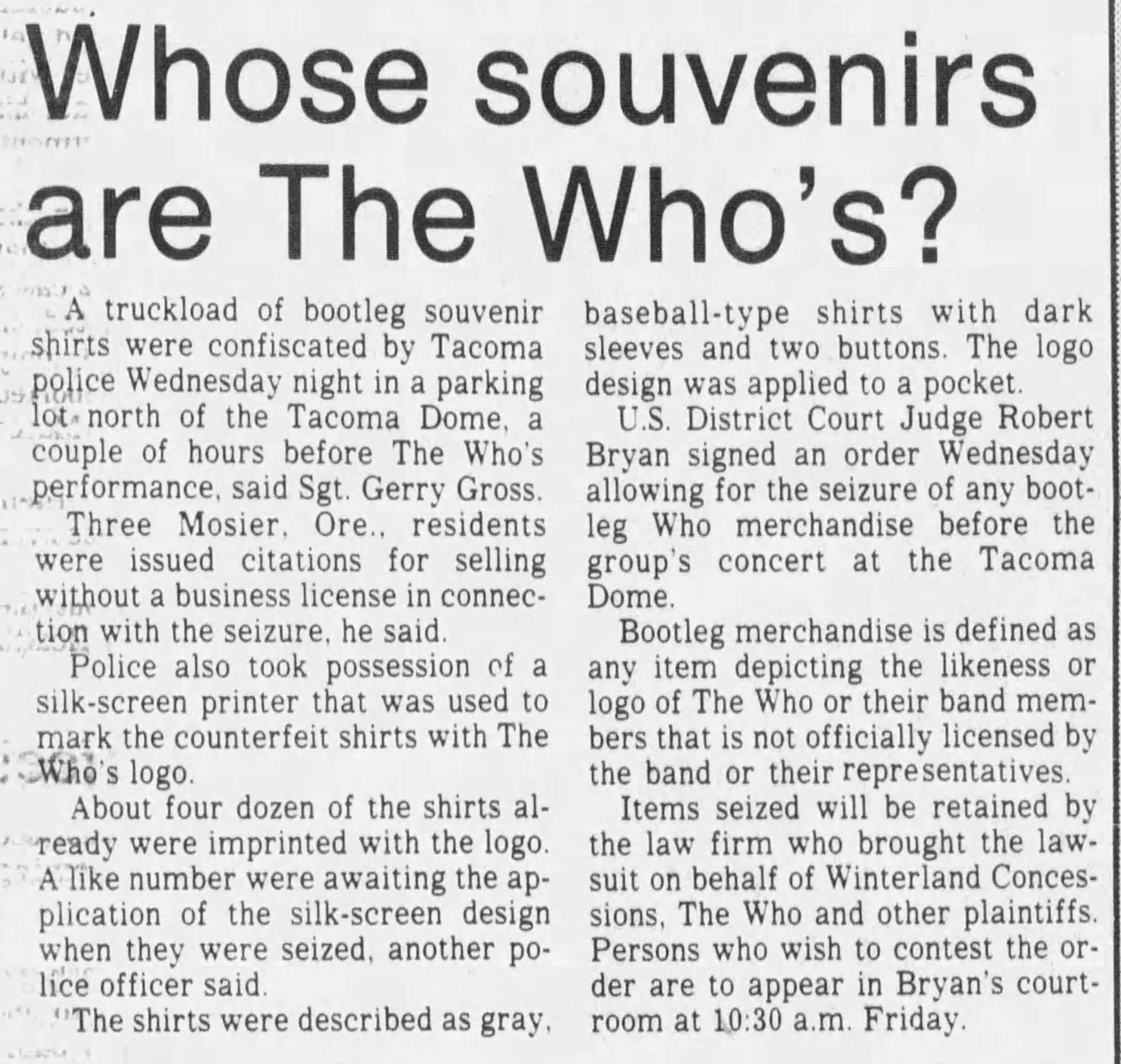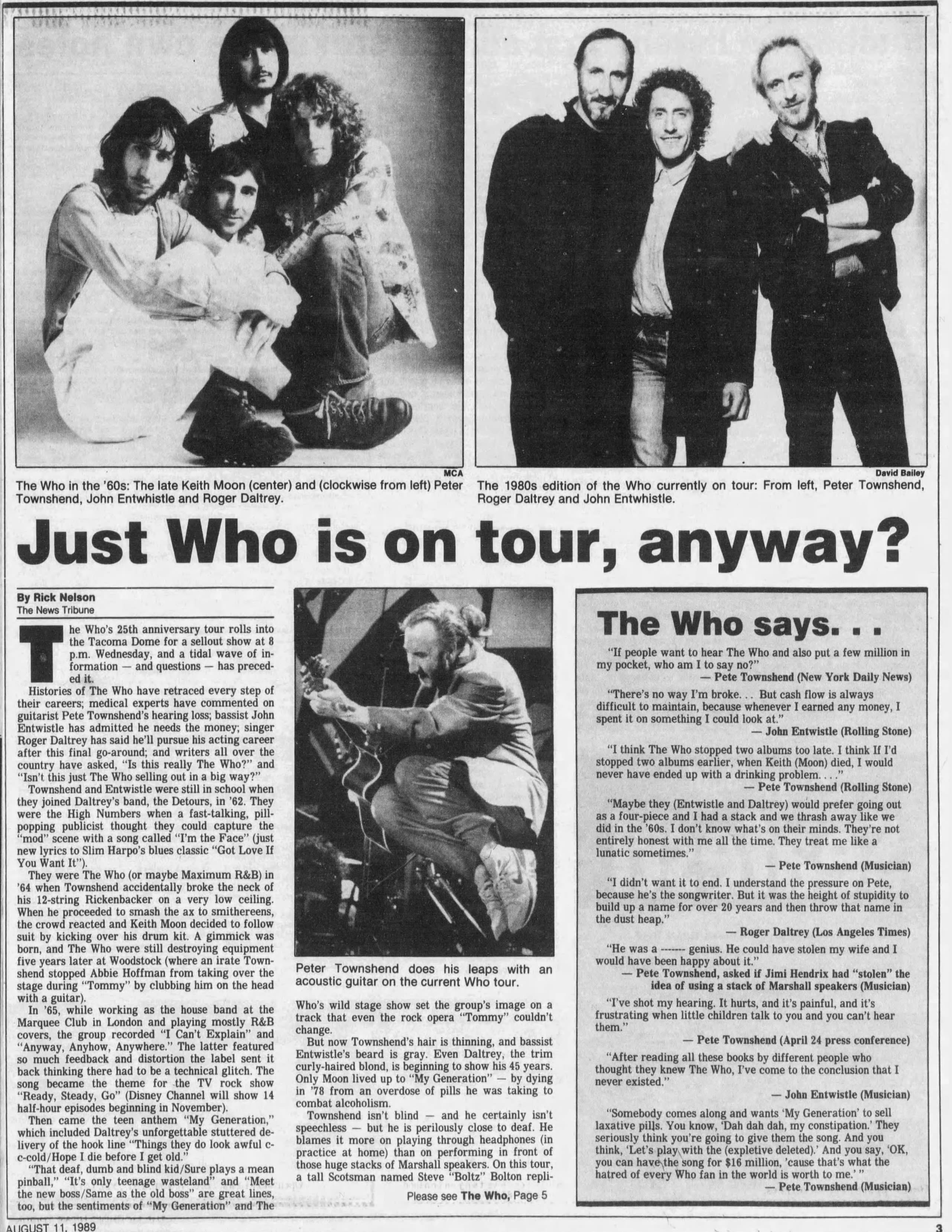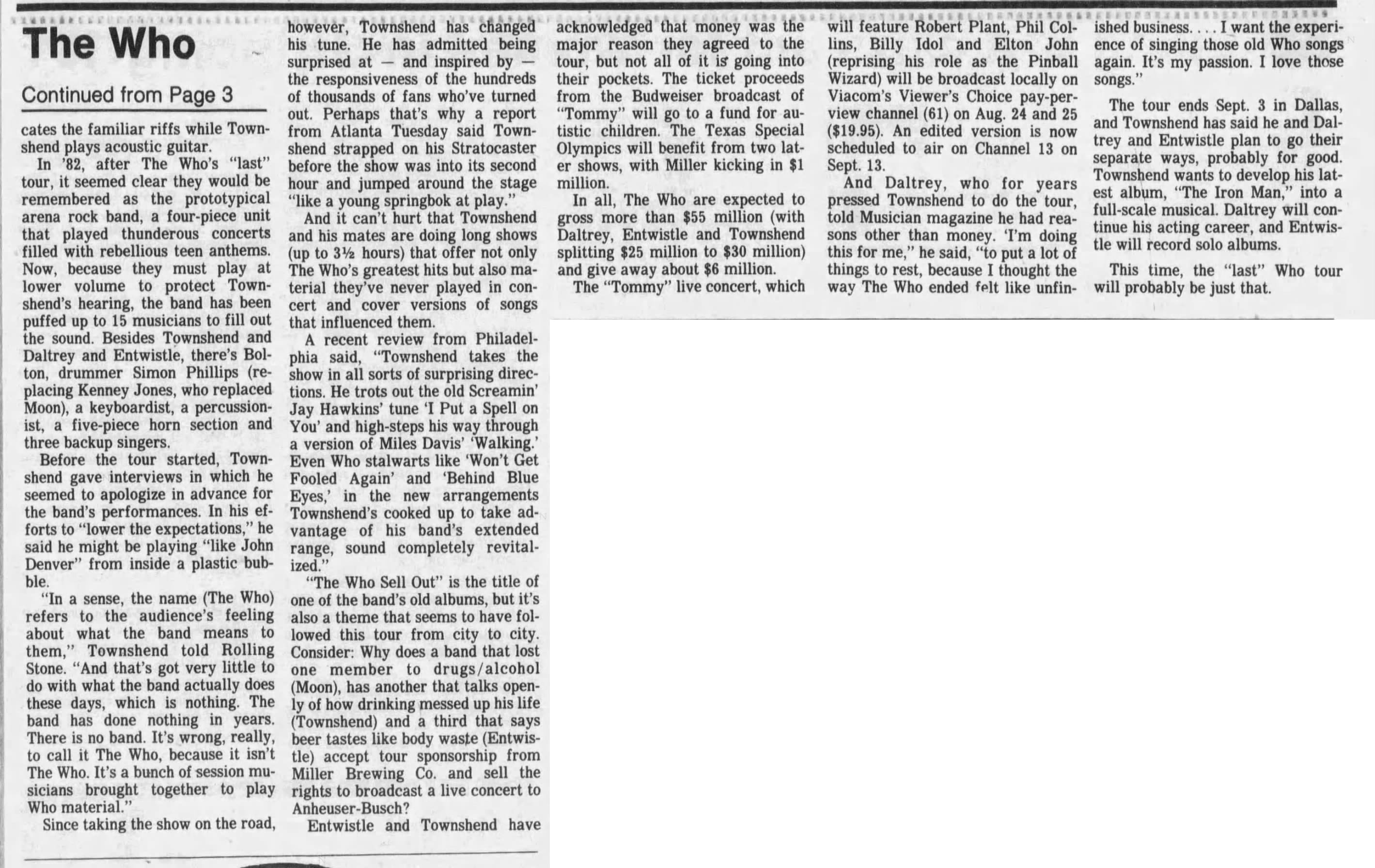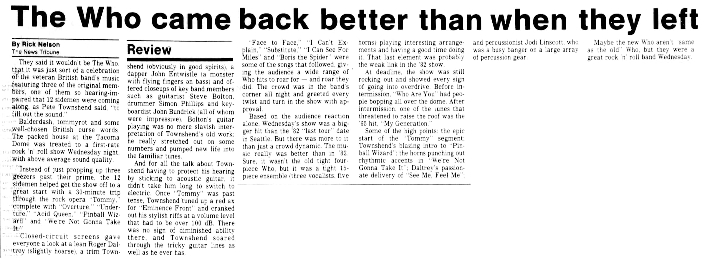 The Who play the Tacoma Dome in Tacoma, Washington. A loose tremolo bar impales Pete's hand in mid-windmill during the conclusion of "Won't Get Fooled Again", driving the bar through the webbing between the fourth and fifth fingers. He is rushed to hospital where he gets stitched up. The rest of the band continues with the encore absent their pierced axeman.