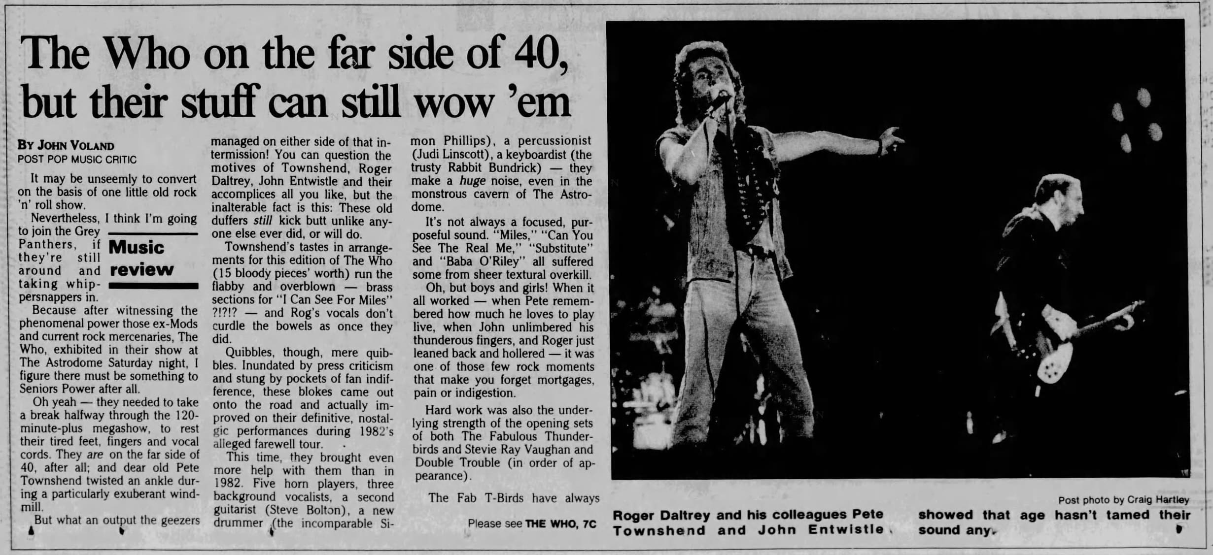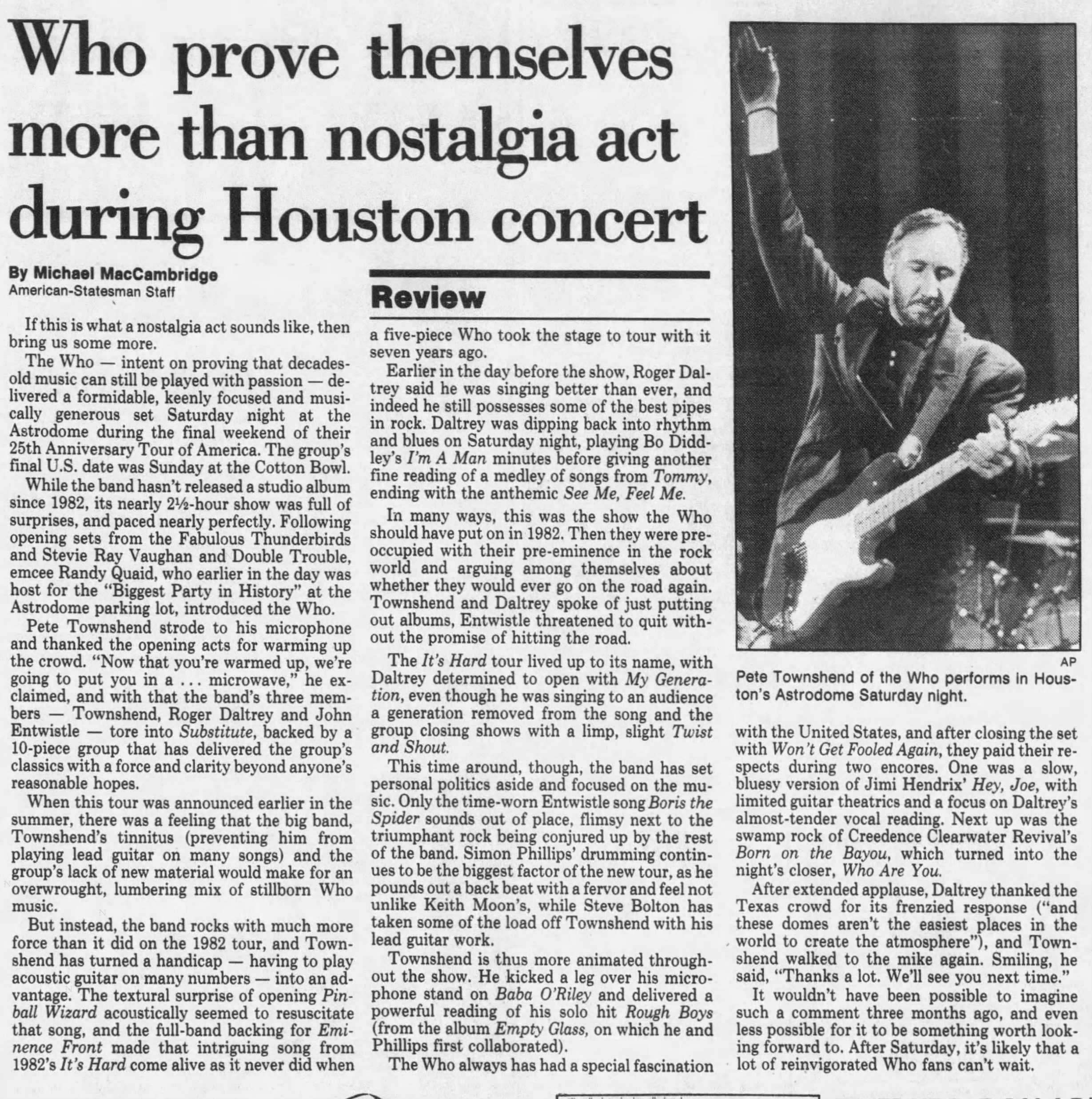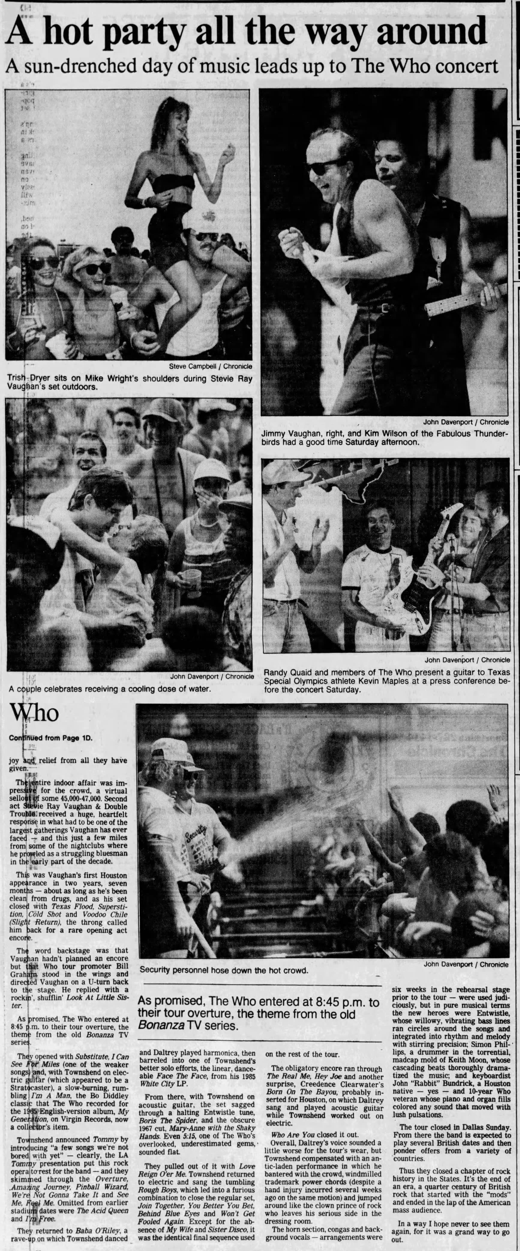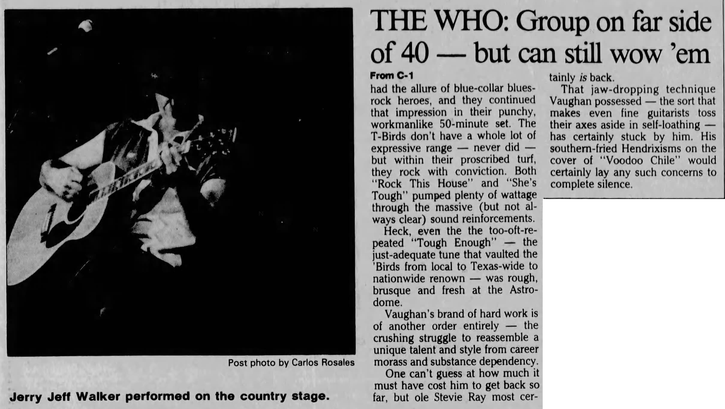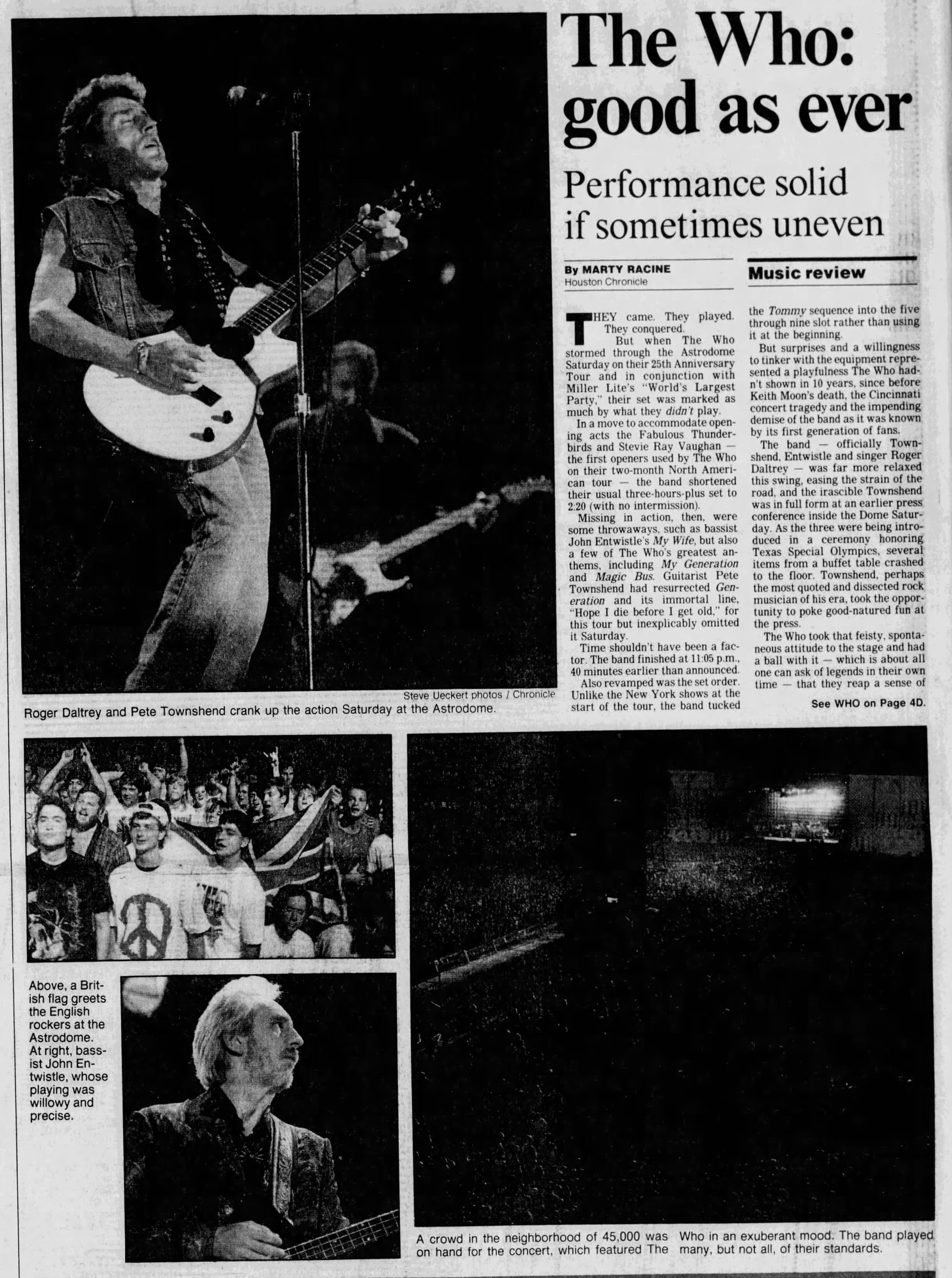 The Who play in Houston at The Astrodome. Opening for them were Stevie Ray Vaughn & Double Trouble and The Fabulous Thunderbirds (w Stevie's brother Jimmie Vaughn)