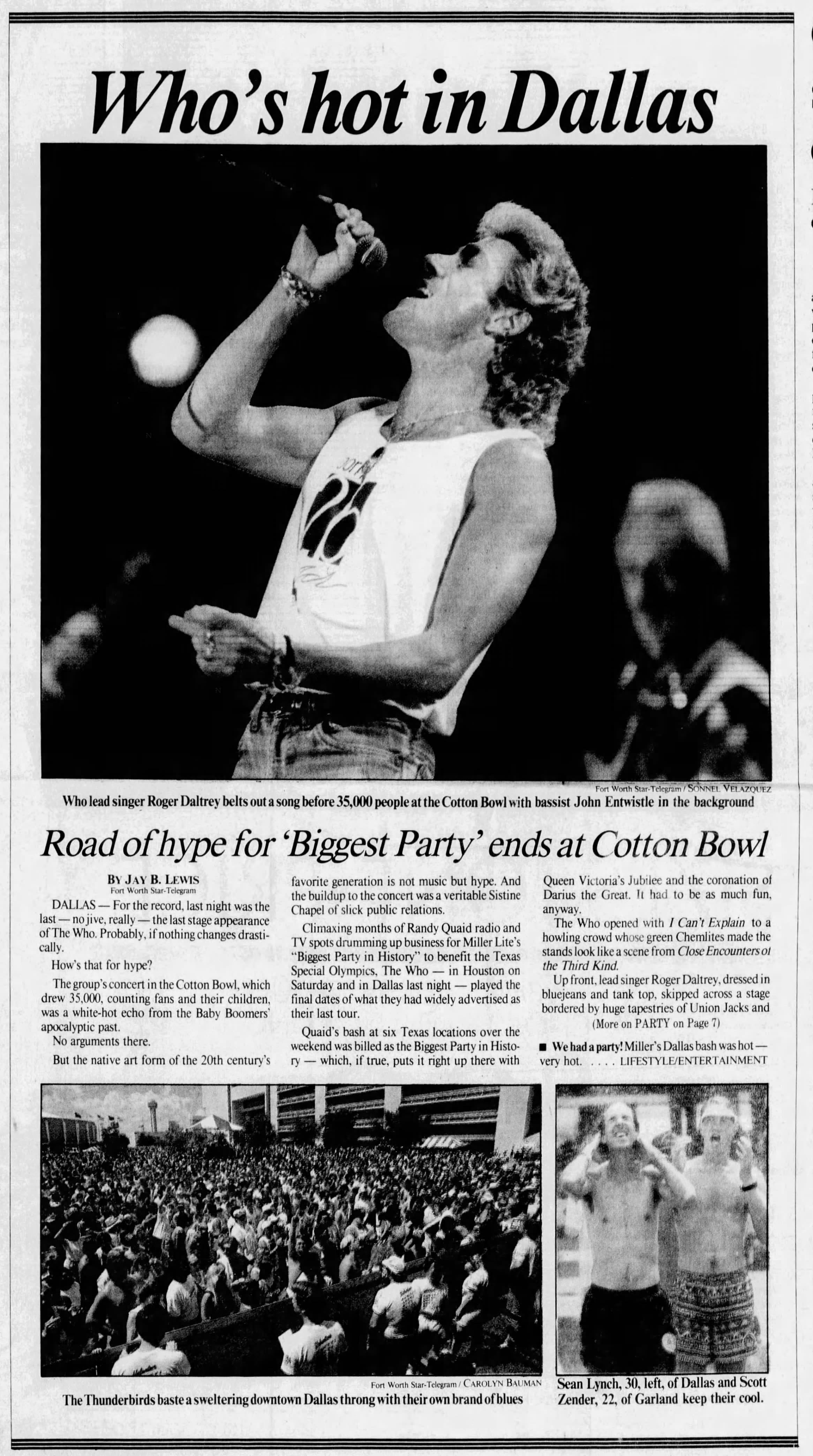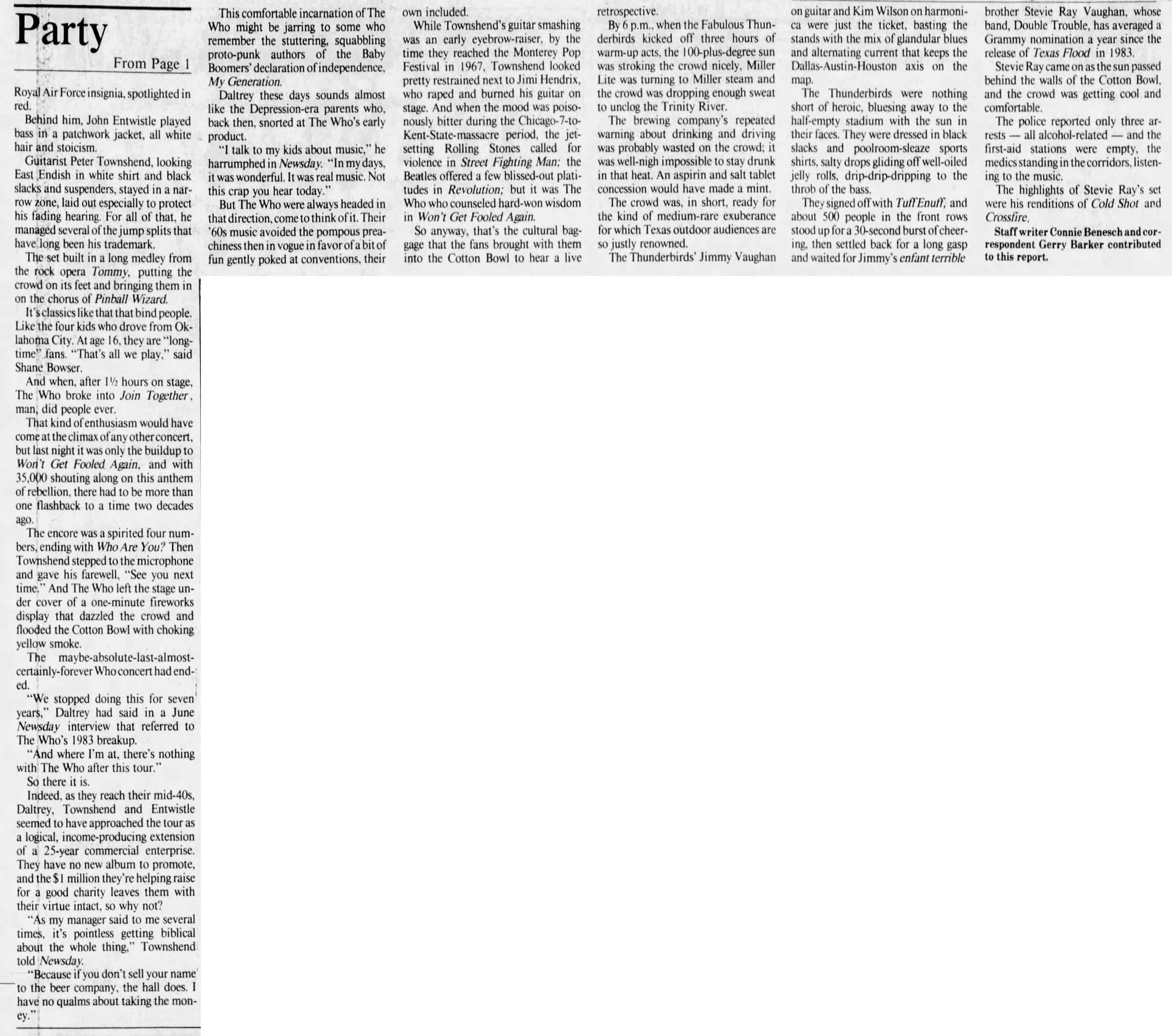 The Who play The Cotton Bowl in Dallas, Texas. Stevie Ray Vaughn & Double Trouble and the Fabulous Thunderbirds open.