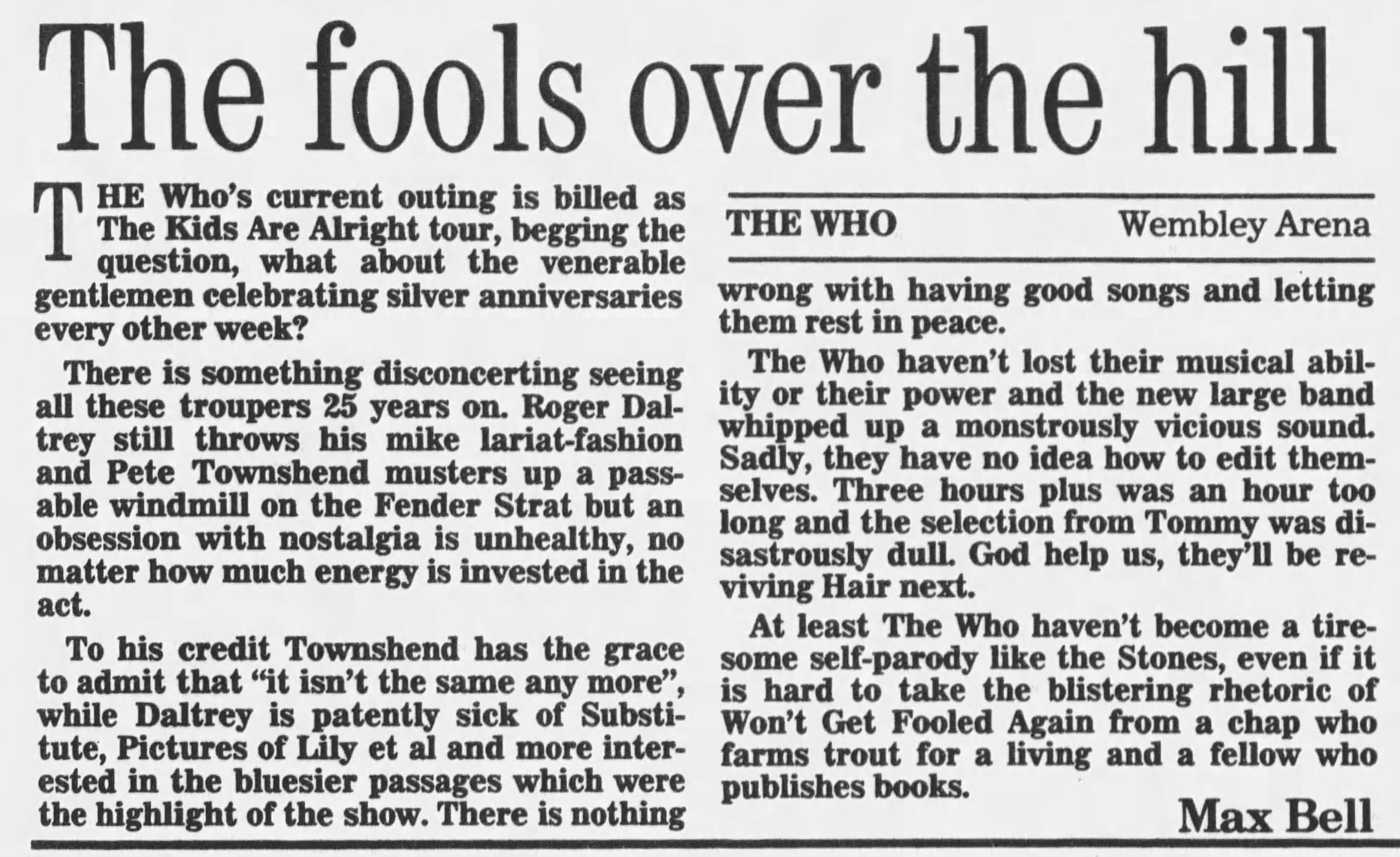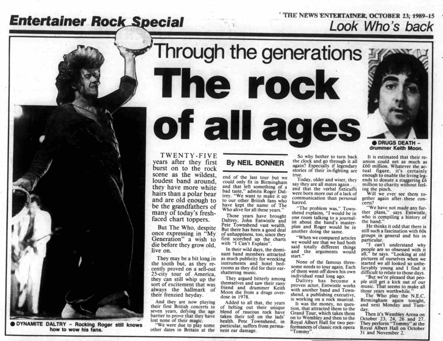 The Who begin four more nights at Wembley Arena in London. Additional dates are on the 24th, 26th and 27th.