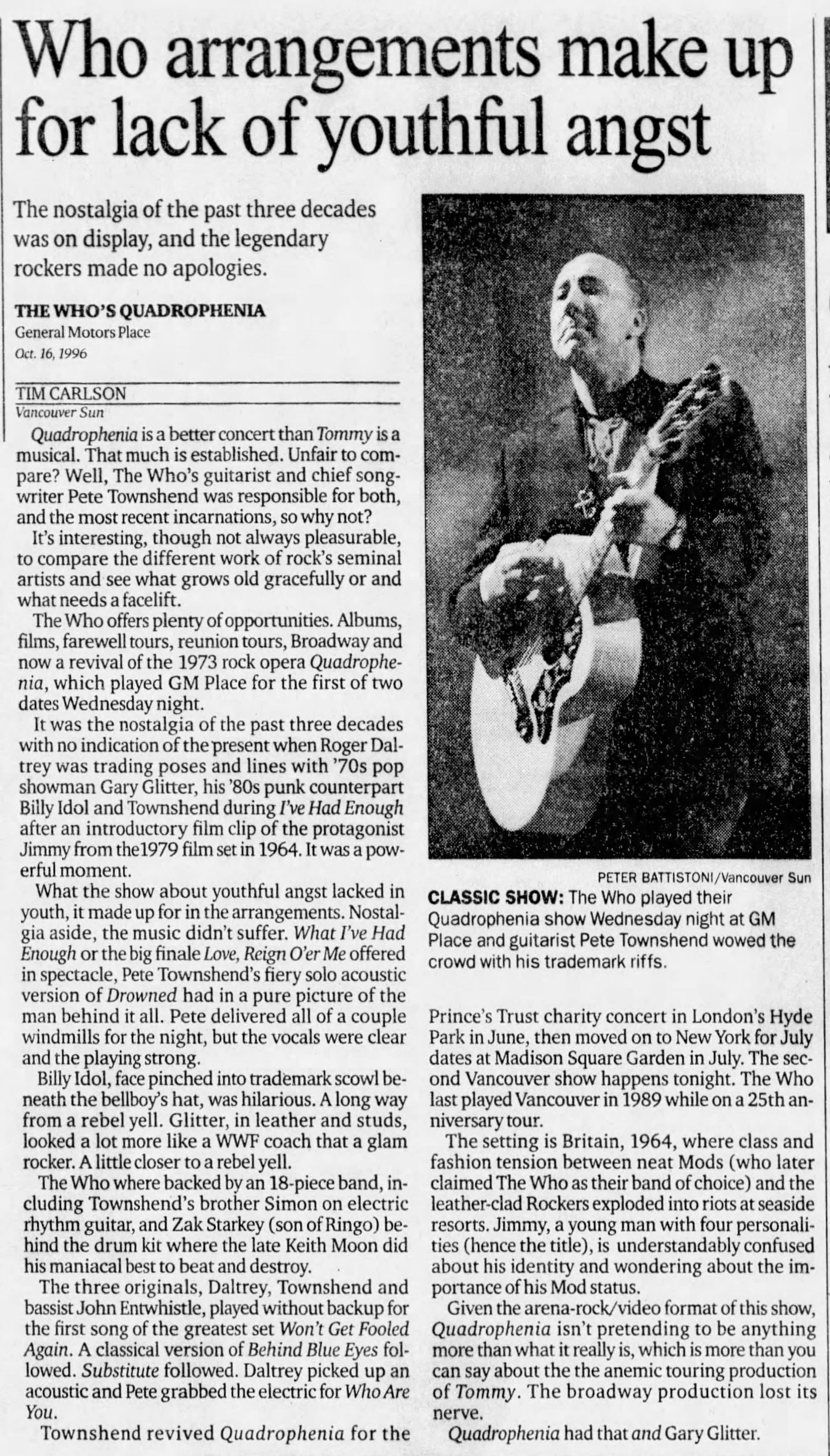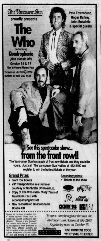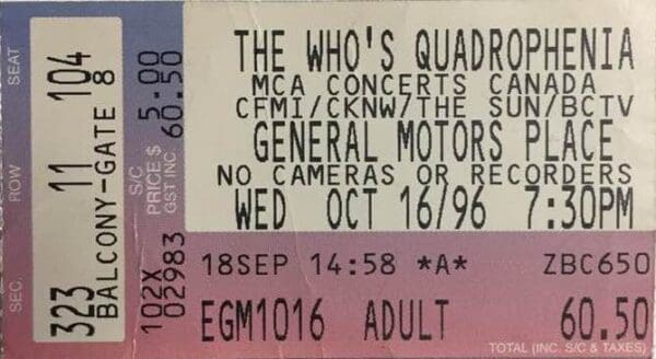 Wednesday, October 16th, 1996 The Who play the General Motors Place in Vancouver, British Columbia, Canada « 1996-10-14 1996-10-17 » Photos Newspapers 1996-10-17-The_Province 1996-10-17-The_Vancouver_Sun https://ia902604.us.archive.org/1/items/Who1996-10-16ThePlaceVancouverCanada/Who1996-10-16ThePlaceVancouverCanada.mp3?cnt=0 Comments Leave a Reply Cancel replyYou must be logged in to post a comment. This site uses Akismet to reduce spam. Learn how your comment data is processed. Map Venue General Motors Place, Vancouver I was there Latitude: 49.277707 Longitude: -123.108800 For more information on The Who’s history and concerts visit our friends www.thewhothismonth.com www.thewholive.com