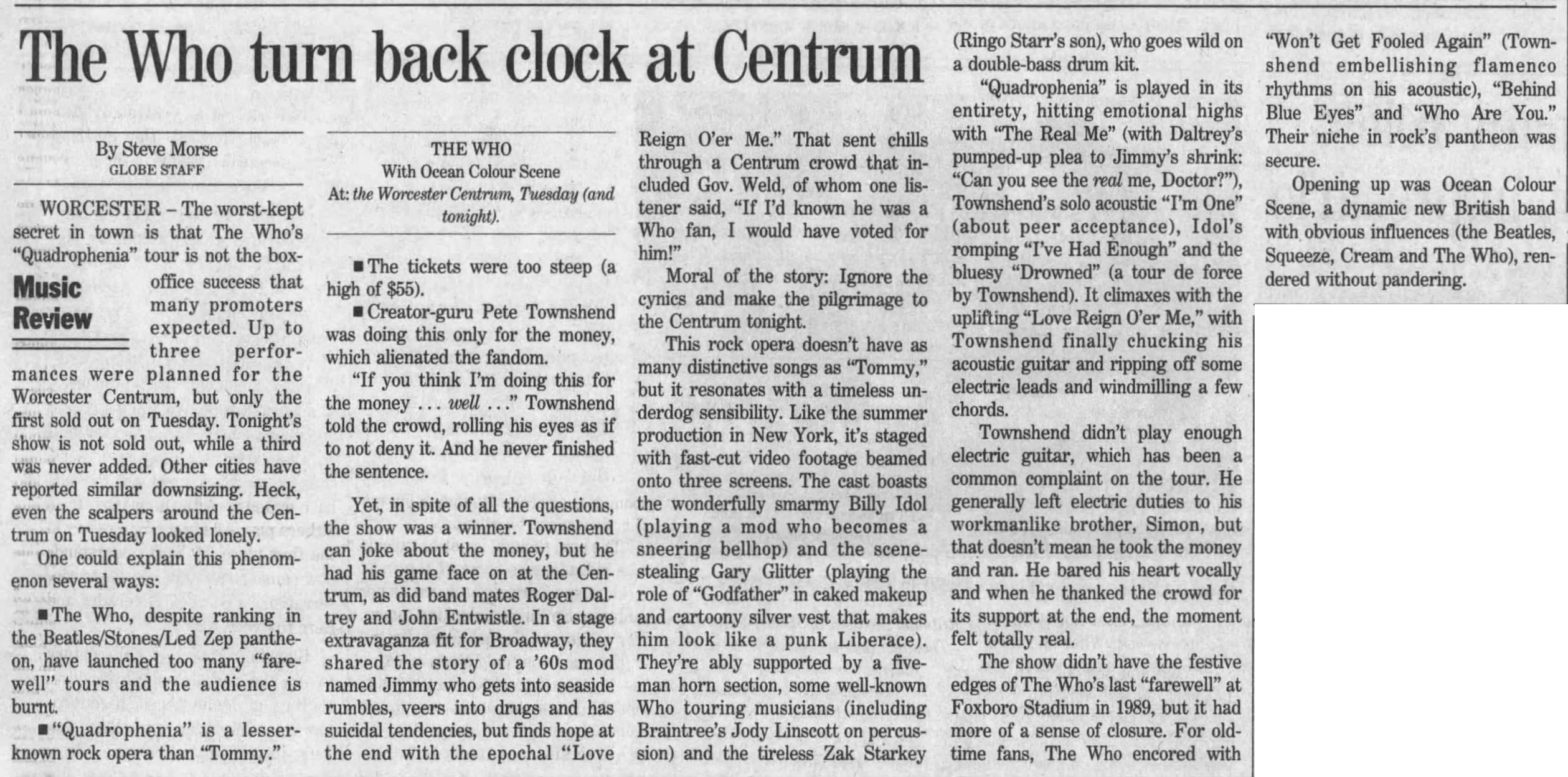 The Who continue the first leg of their North American Quadrophenia tour with a performance at the Centrum in Worcester, Massachusetts with Ocean Colour Scene opening
