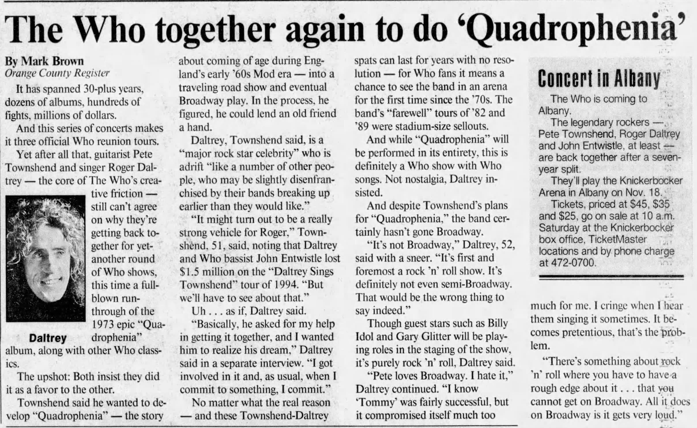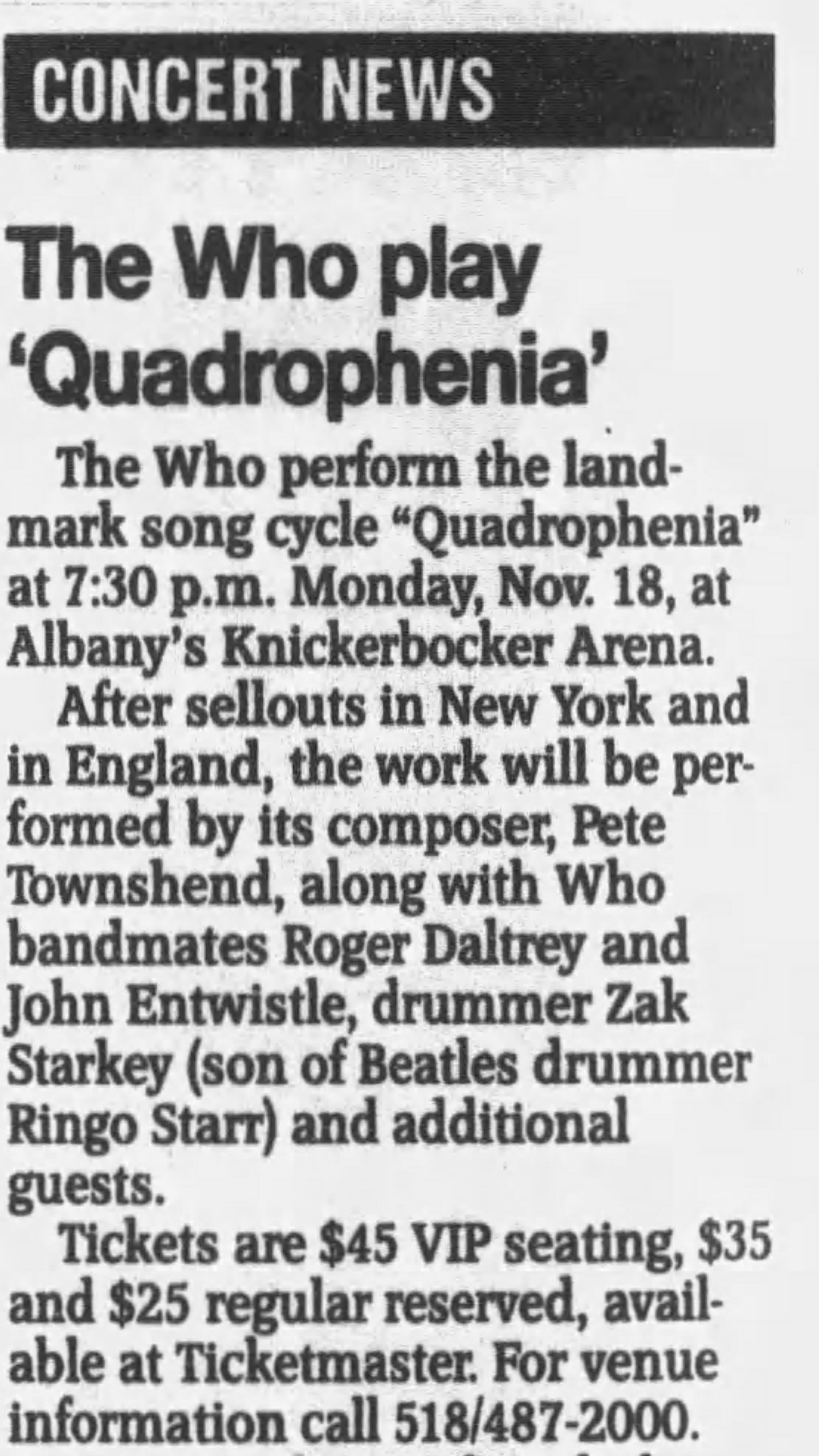 The Who continue the first leg of their North American Quadrophenia tour with a performance at the Knickerbocker Arena in Albany, New York