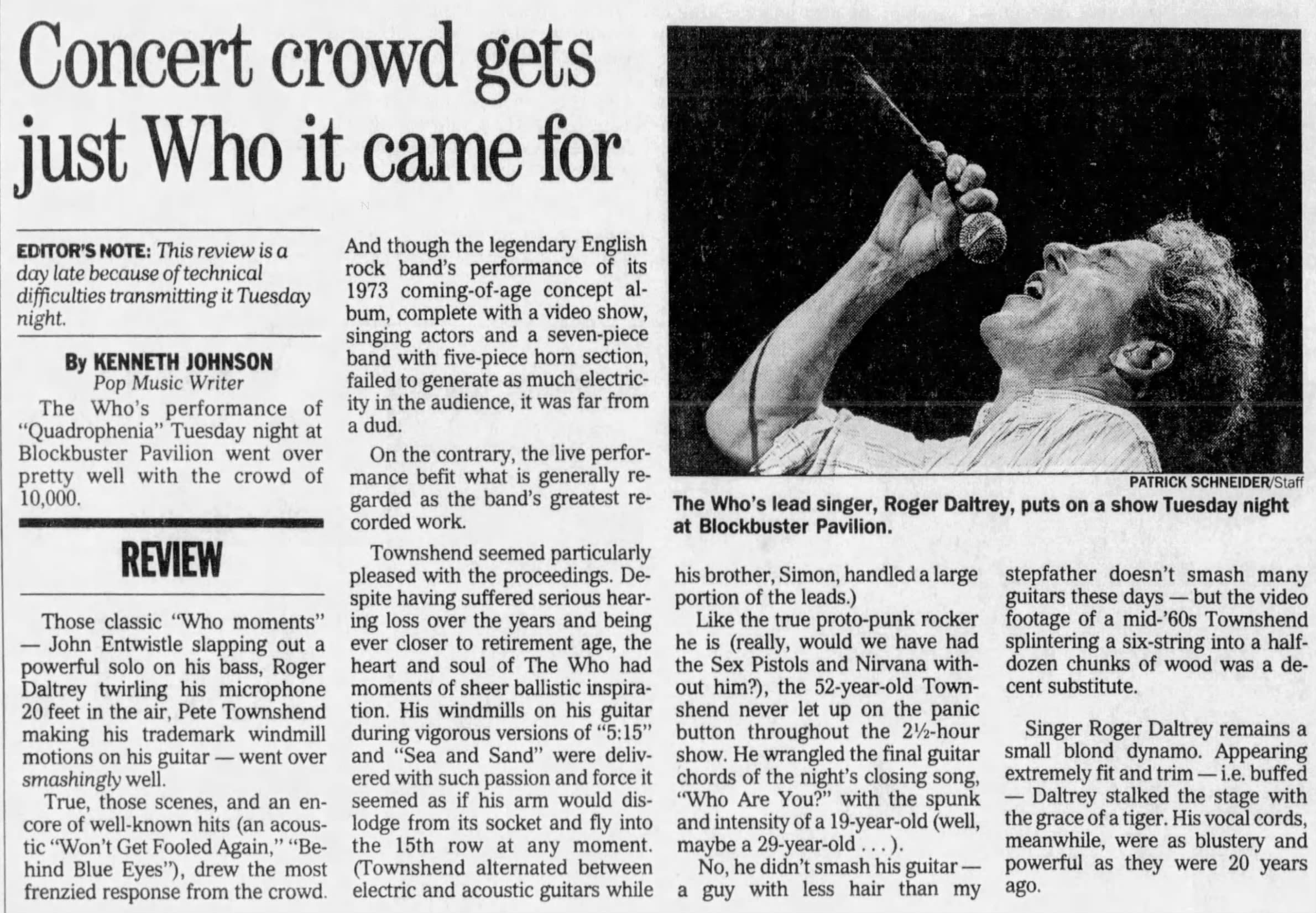 Tuesday, August 12th, 1997 The Who play the Blockbuster Pavilion in Charlotte, North Carolina « 1997-08-10 1997-08-13 » Photos Newspapers 1997-08-14-The_Charlotte_Observer Comments Leave a Reply Cancel replyYou must be logged in to post a comment. This site uses Akismet to reduce spam. Learn how your comment data is processed. Map Venue Blockbuster Pavilion, Charlotte I was there Latitude: 35.327364 Longitude: -80.710840 For more information on The Who’s history and concerts visit our friends www.thewhothismonth.com www.thewholive.com