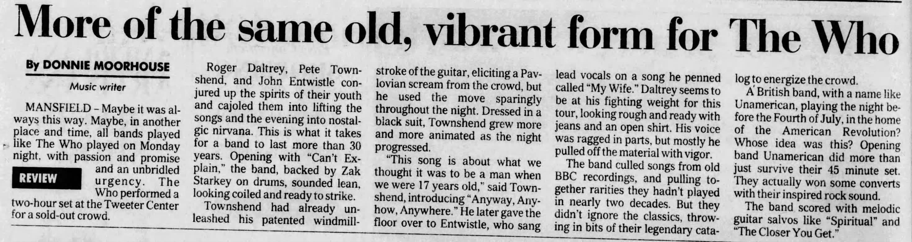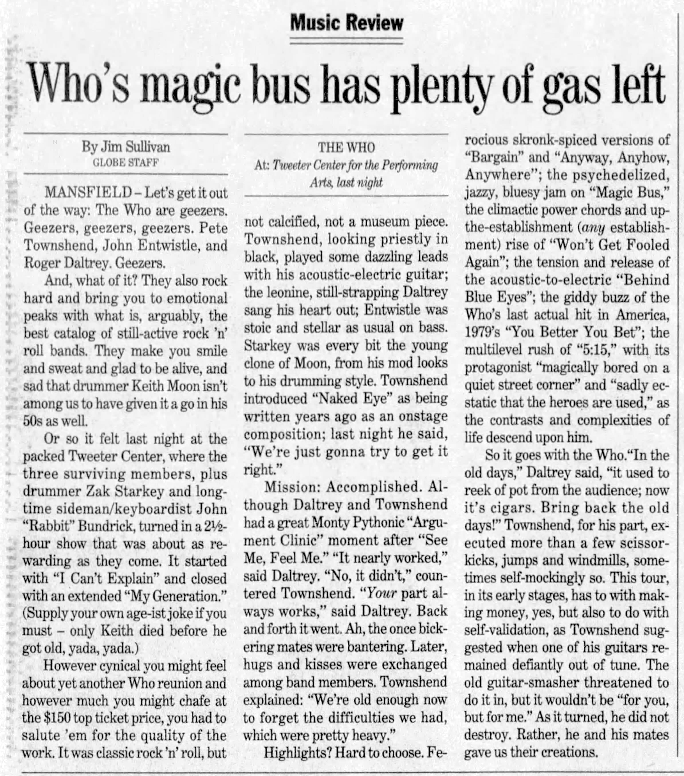 The Who play the Tweeter Center in Mansfield, Massachusetts
