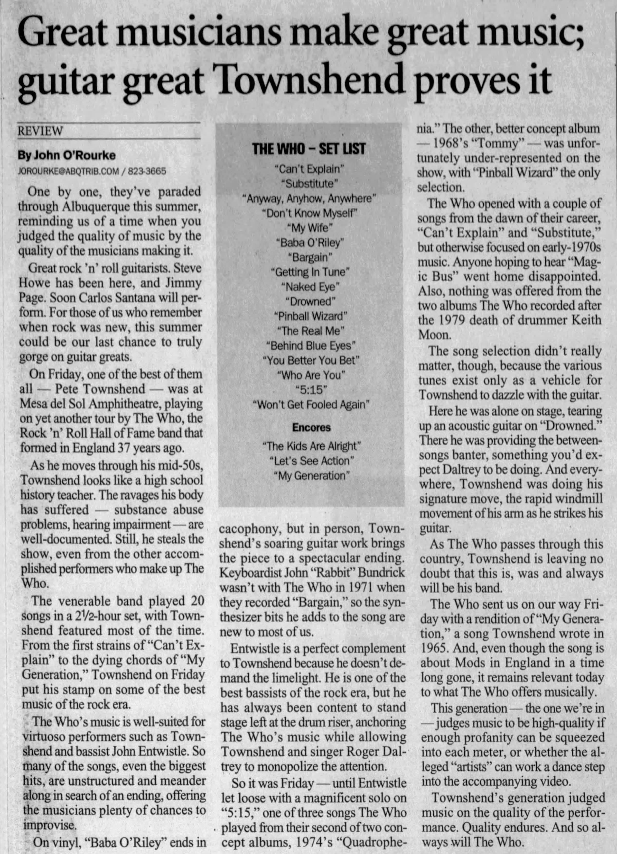 The Who play the Mesa del Sol Amphitheater in Alburquerque, New Mexico. You can listen to the show on YouTube here: https://www.youtube.com/watch?v=ZXHtt93QG6U
