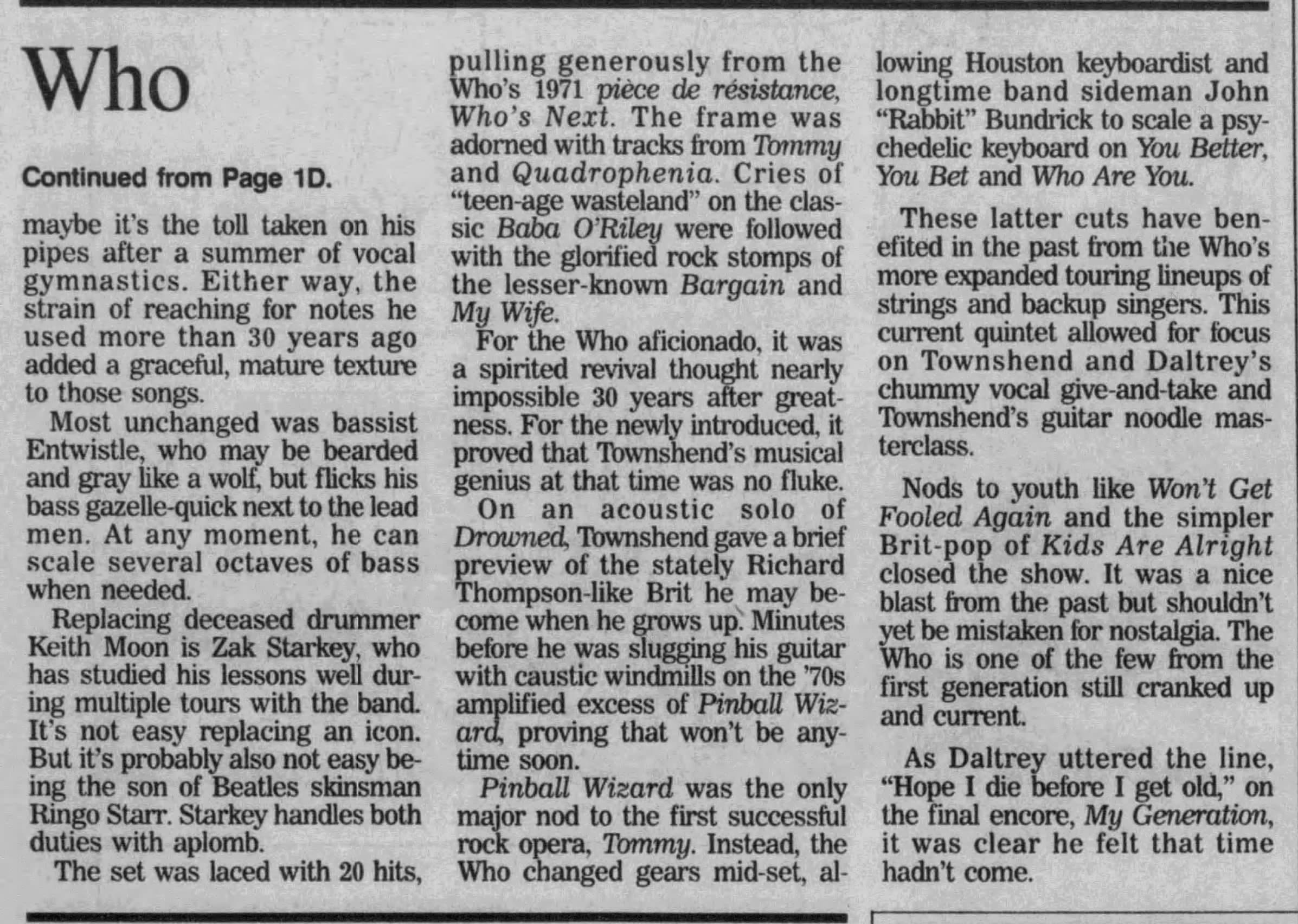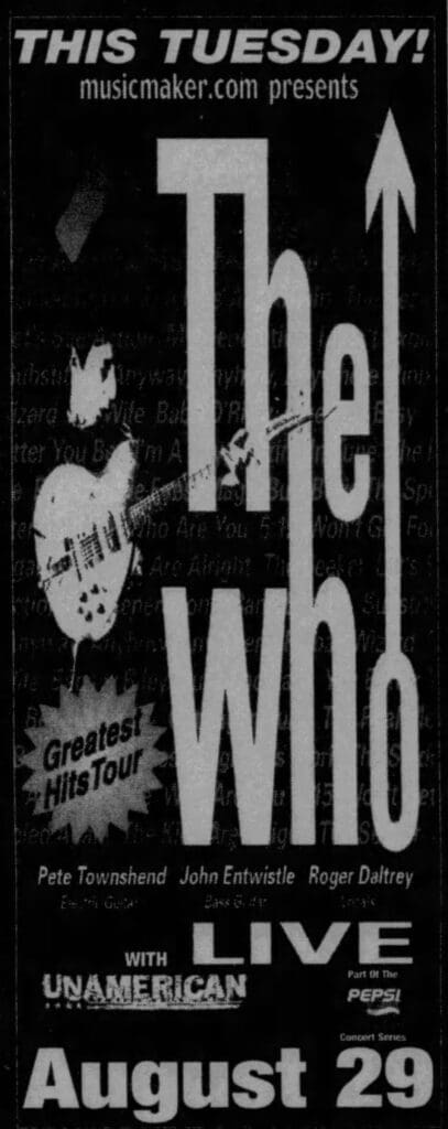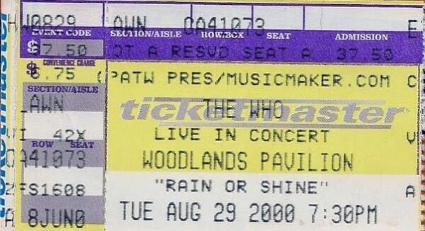 Tuesday, August 29th, 2000 The Who play in Woodlands, Texas at the Woodlands Pavilion. « 2000-08-27 2000-09-24 » Photos WhoTube Newspapers 2000-08-31-The_Houston_Chronicle_1 2000-08-31-The_Houston_Chronicle_2 Comments Leave a Reply Cancel replyYou must be logged in to post a comment. This site uses Akismet to reduce spam. Learn how your comment data is processed. Map Venue Woodlands Pavilion I was there Latitude: 30.161593 Longitude: -95.464029 For more information on The Who’s history and concerts visit our friends www.thewhothismonth.com www.thewholive.com