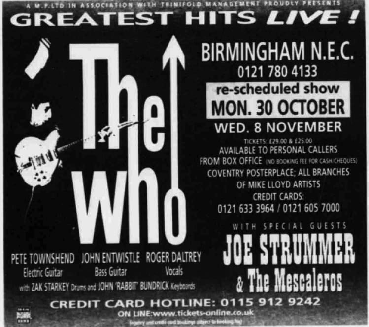 Monday, October 30th, 2000 The Who play the National Exhibition Centre Arena in Birmingham « 2000-10-07 2000-11-02 » Newspapers 2000-10-20-Wolverhampton Express and Star Comments Leave a Reply Cancel replyYou must be logged in to post a comment. This site uses Akismet to reduce spam. Learn how your comment data is processed. Map Venue National Exhibition Centre Arena, Birmingham I was there Latitude: 52.448296 Longitude: -1.720339 For more information on The Who’s history and concerts visit our friends www.thewhothismonth.com www.thewholive.com