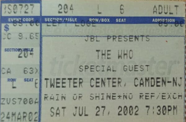 Saturday, July 27th, 2002 The Who play the Tweeter Center at the Waterfront in Camden, New Jersey « 2002-07-26 2002-07-29 » WhoTube Comments Leave a Reply Cancel replyYou must be logged in to post a comment. This site uses Akismet to reduce spam. Learn how your comment data is processed. Map Venue Tweeter Center at the Waterfront, Camden I was there Latitude: 39.940396 Longitude: -75.129970 For more information on The Who’s history and concerts visit our friends www.thewhothismonth.com www.thewholive.com