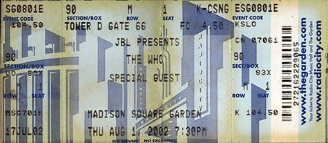 Thursday, August 1st, 2002 The Who play Madison Square Gardens in New York City, New York « 2002-07-31 2002-08-03 » Comments Leave a Reply Cancel replyYou must be logged in to post a comment. This site uses Akismet to reduce spam. Learn how your comment data is processed. Map Venue Madison Square Garden I was there Latitude: 40.749592 Longitude: -73.991642 For more information on The Who’s history and concerts visit our friends www.thewhothismonth.com www.thewholive.com