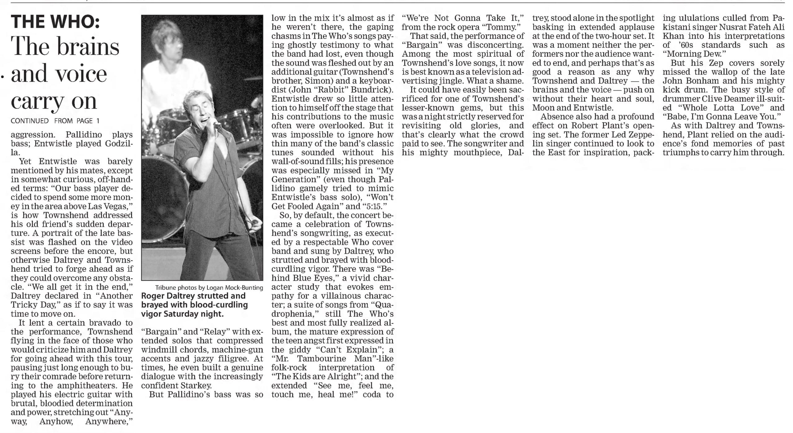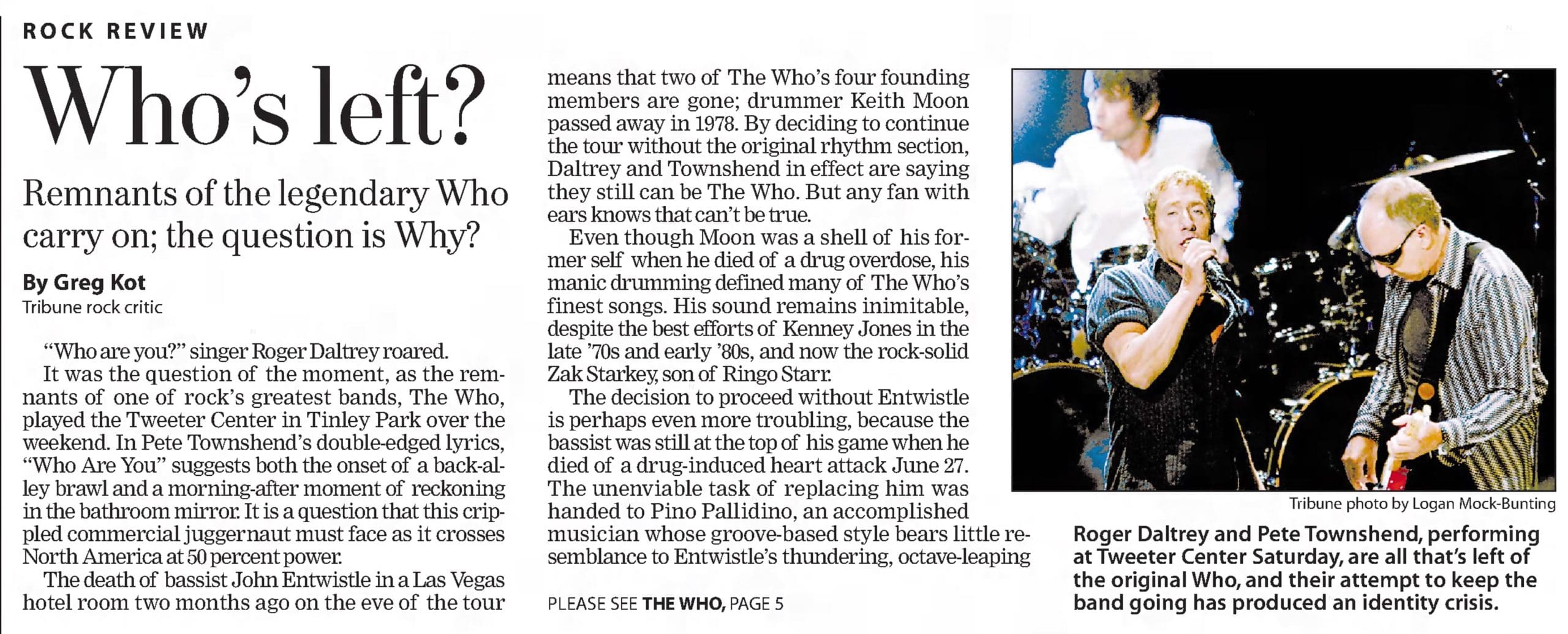 Saturday, August 24th, 2002 The Who play the Tweeter Center in Tinley Park, Illinois « 2002-08-23 2002-08-25 » Photos Newspapers 2002-08-16-Chicago_Tribune 2002-08-26-Chicago_Tribune_1 2002-08-26-Chicago_Tribune_2 Comments Leave a Reply Cancel replyYou must be logged in to post a comment. This site uses Akismet to reduce spam. Learn how your comment data is processed. Map Venue Tweeter Center, Tinley Park I was there Latitude: 41.543933 Longitude: -87.775795 For more information on The Who’s history and concerts visit our friends www.thewhothismonth.com www.thewholive.com