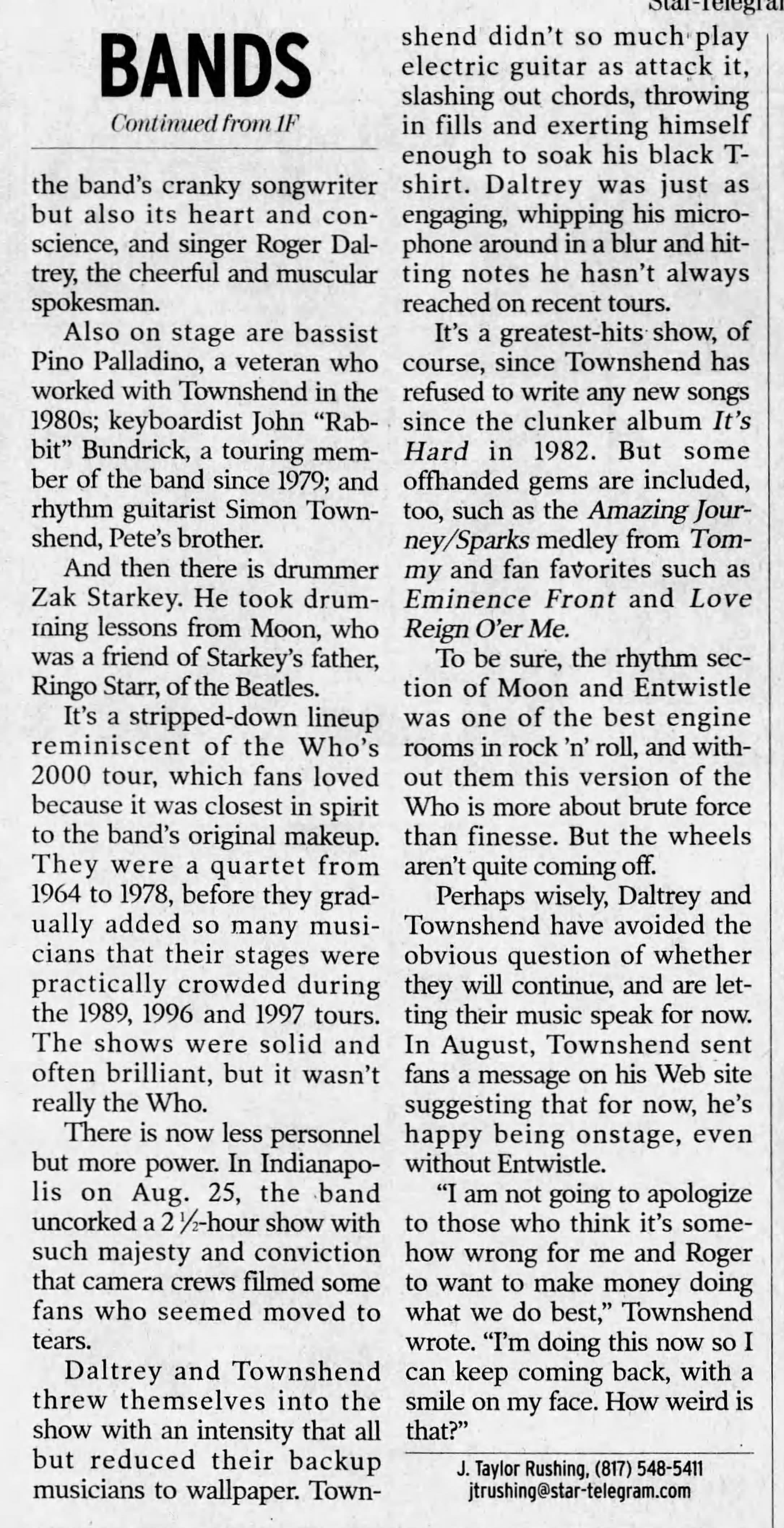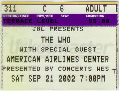 Saturday, September 21st, 2002 The Who play the American Airlines Center in Dallas, Texas « 2002-09-19 2002-09-23 » Newspapers 2002-09-20-Fort_Worth_Star_Telegram 2002-09-21-Fort_Worth_Star_Telegram_1 2002-09-21-Fort_Worth_Star_Telegram_2 2002-09-22-Fort_Worth_Star_Telegram Comments Leave a Reply Cancel replyYou must be logged in to post a comment. This site uses Akismet to reduce spam. Learn how your comment data is processed. Map Venue American Airlines Center, Dallas I was there Latitude: 32.790673 Longitude: -96.810563 For more information on The Who’s history and concerts visit our friends www.thewhothismonth.com www.thewholive.com