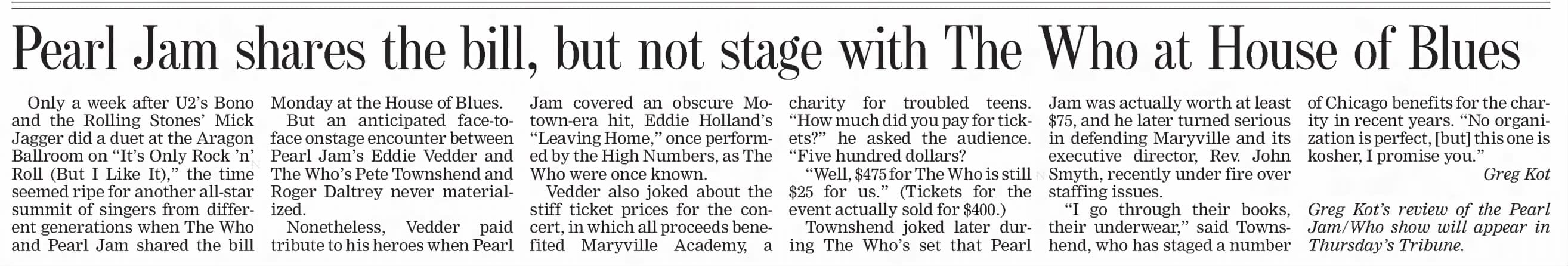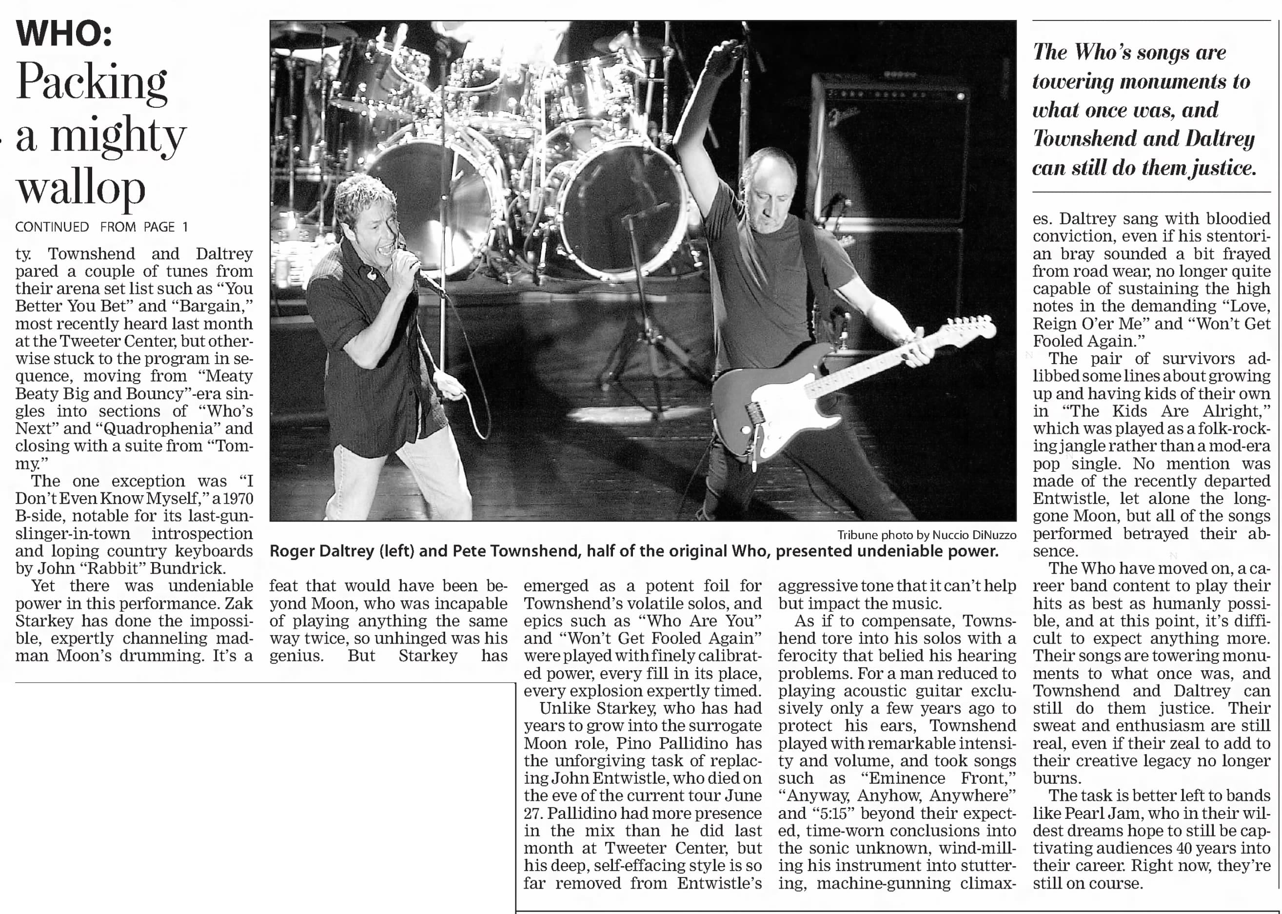 Monday, September 23rd, 2002 The Who play The House of Blues in Chicago, Illinois « 2002-09-21 2002-09-24 » Newspapers 2002-09-25-Chicago_Tribune 2002-09-26-Chicago_Tribune_1 2002-09-26-Chicago_Tribune_2 Comments Leave a Reply Cancel replyYou must be logged in to post a comment. This site uses Akismet to reduce spam. Learn how your comment data is processed. Map Venue The House Of Blues I was there Latitude: 41.888230 Longitude: -87.629095 For more information on The Who’s history and concerts visit our friends www.thewhothismonth.com www.thewholive.com