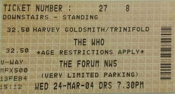 Wednesday, March 24th, 2004 The Who play the London Forum in Kentish Town, London « 2004-03-22 2004-03-25 » Comments Leave a Reply Cancel replyYou must be logged in to post a comment. This site uses Akismet to reduce spam. Learn how your comment data is processed. Map Venue London Forum, Kentish Town I was there Latitude: 51.552179 Longitude: -0.142036 For more information on The Who’s history and concerts visit our friends www.thewhothismonth.com www.thewholive.com
