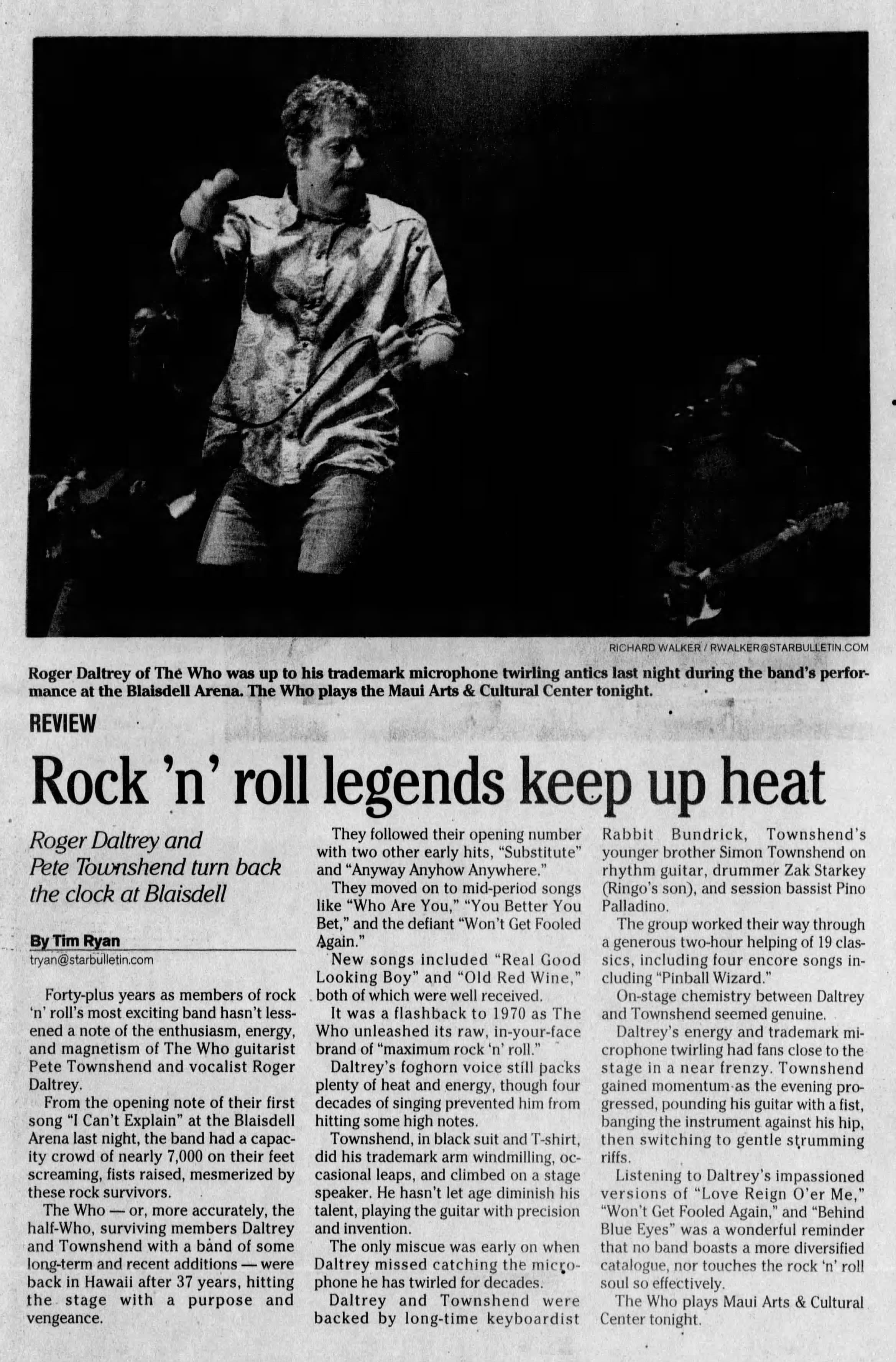 Tuesday, August 3rd, 2004 The Who play the Neal S. Blaisdell Center in Honolulu, Hawaii « 2004-07-31 2004-08-04 » WhoTube Newspapers 2004-08-04-Honolulu_Star_Advertiser 2004-08-04-Honolulu_Star_Bulletin Comments Leave a Reply Cancel replyYou must be logged in to post a comment. This site uses Akismet to reduce spam. Learn how your comment data is processed. Map Venue Neal S. Blaisdell Center, Honolulu I was there Latitude: 21.299831 Longitude: -157.850917 For more information on The Who’s history and concerts visit our friends www.thewhothismonth.com www.thewholive.com