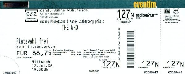 Wednesday, July 12th, 2006 The Who play the Treptow Arena in Berlin, Germany « 2006-07-11 2006-07-14 » WhoTube Comments Leave a Reply Cancel replyYou must be logged in to post a comment. This site uses Akismet to reduce spam. Learn how your comment data is processed. Map Venue Treptow Arena, Berlin I was there Latitude: 52.497070 Longitude: 13.453879 For more information on The Who’s history and concerts visit our friends www.thewhothismonth.com www.thewholive.com