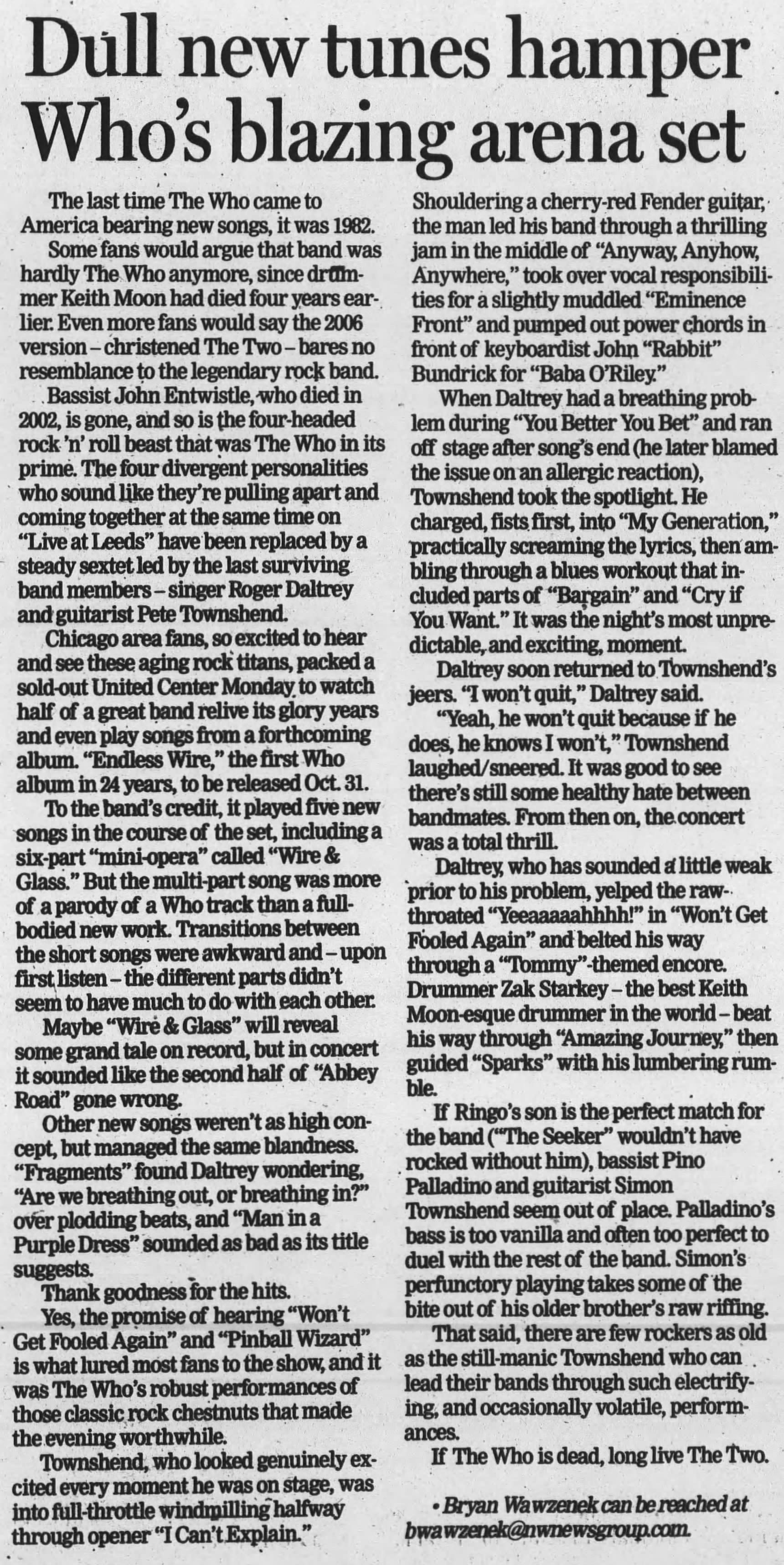 The Who play the United Center in Chicago, Illinois. Roger has to leave the stage for 15 minutes when his throat closes after an allergic reaction. Pete does "My Generation" solo