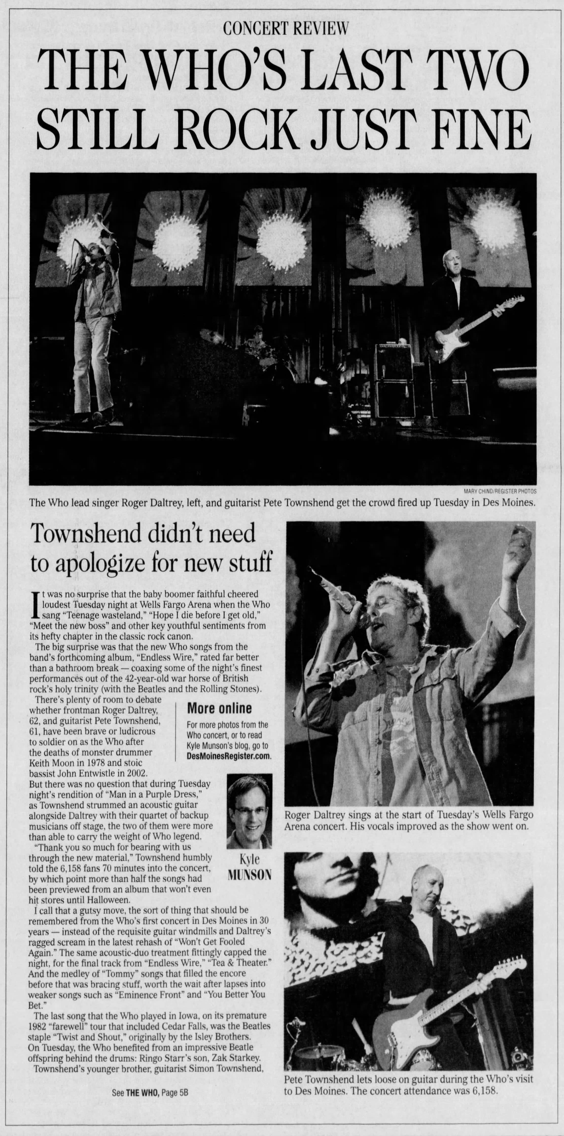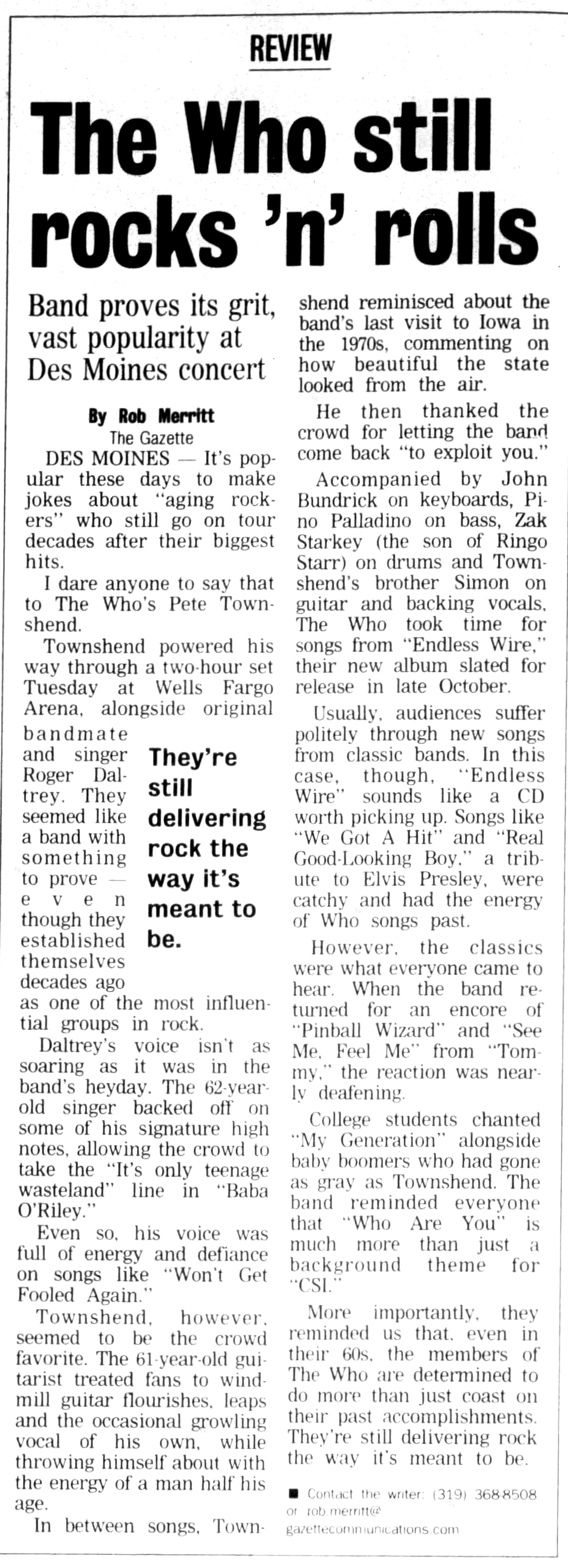 The Who play the Wells Fargo Arena in Des Moines, Iowa