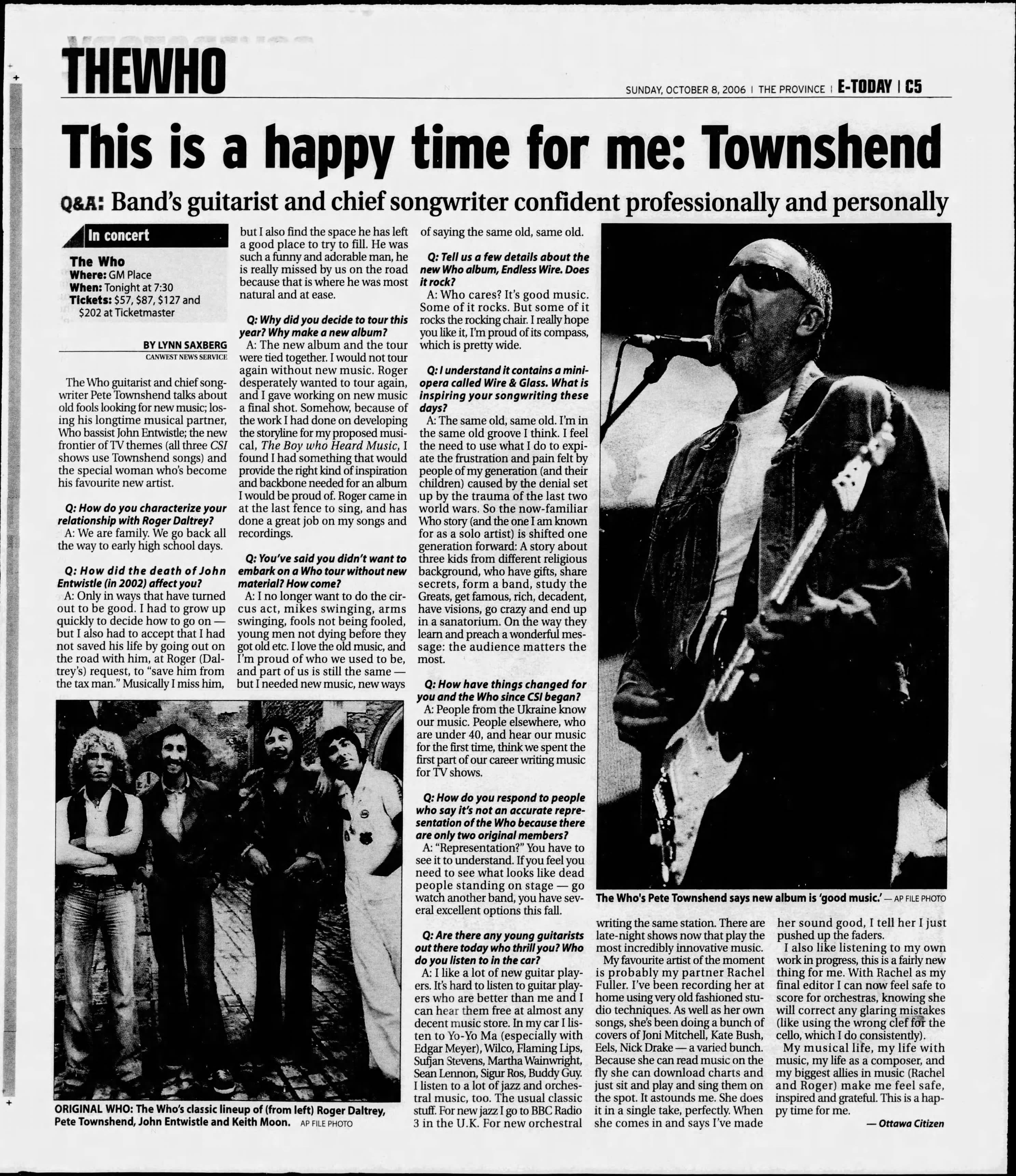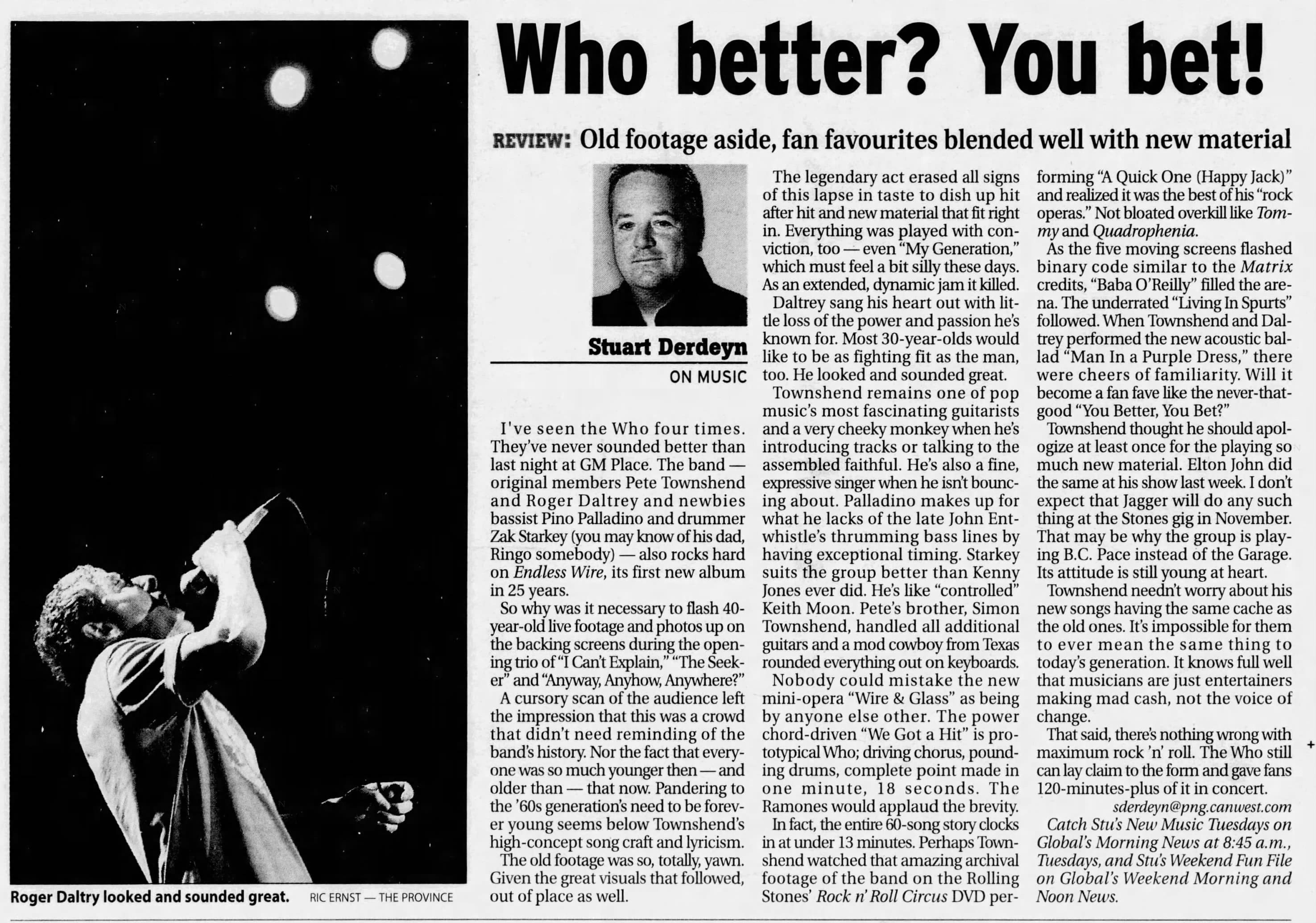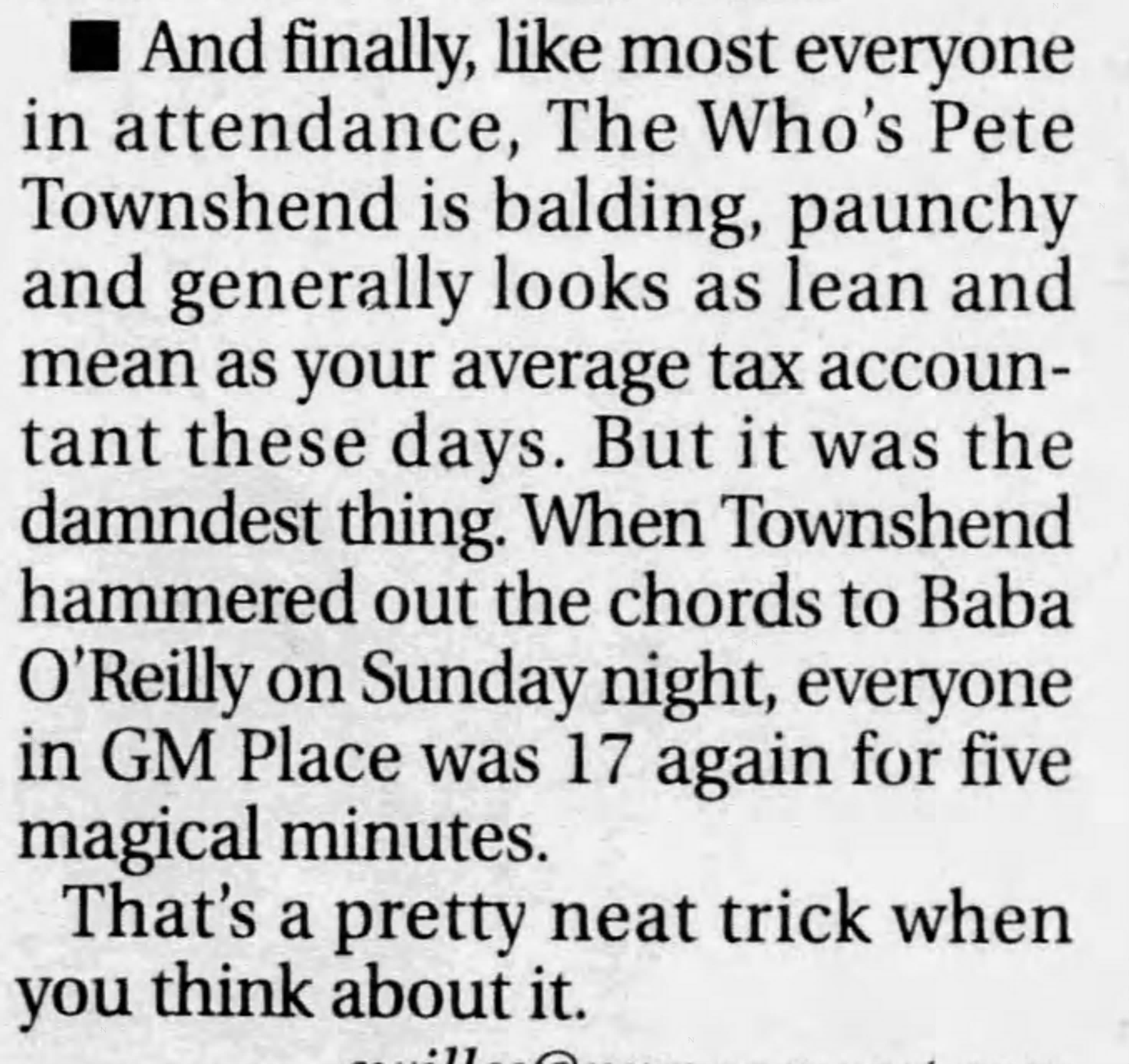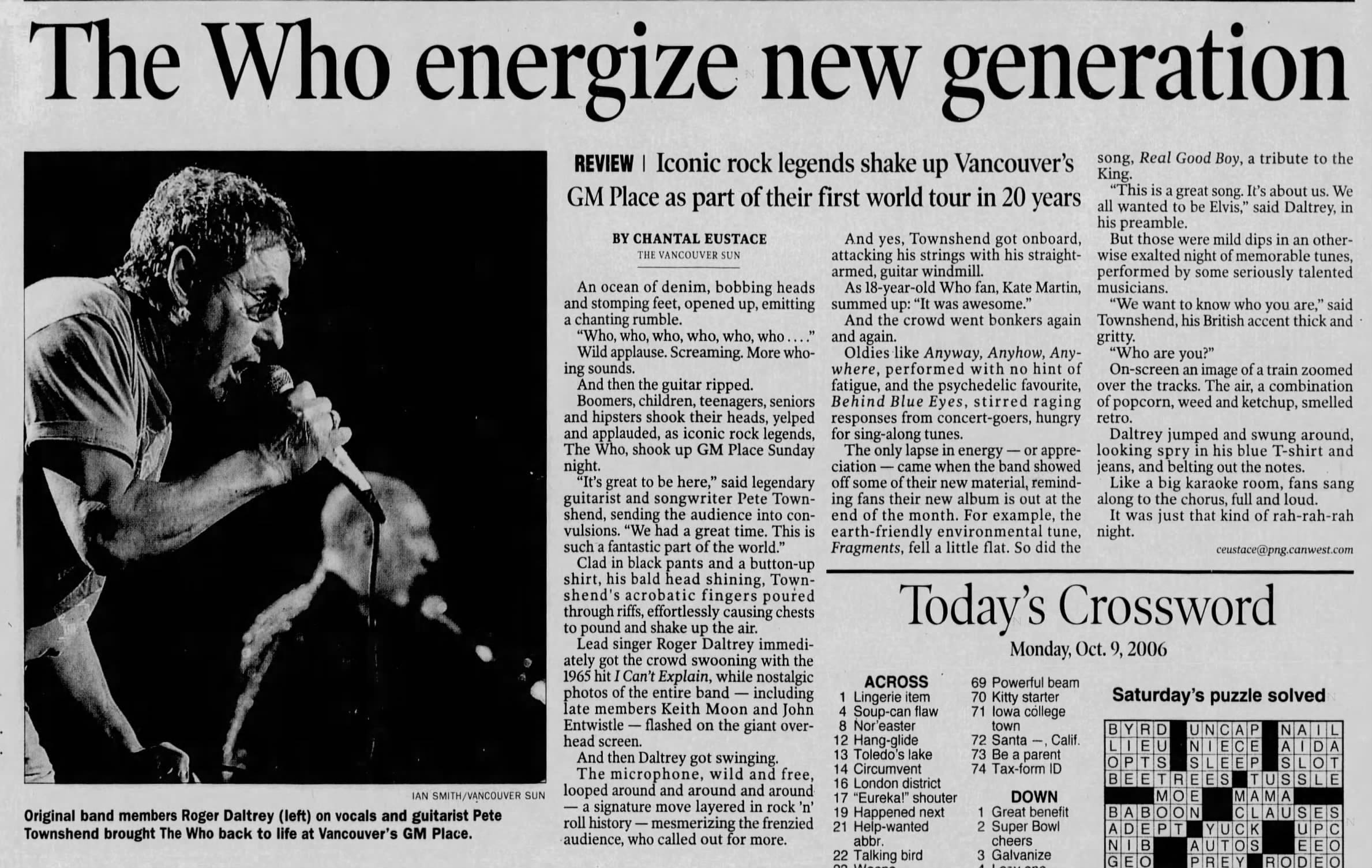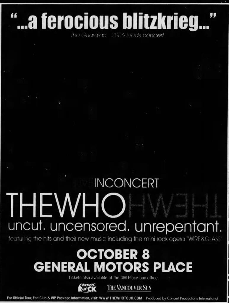 Sunday, October 8th, 2006 The Who play the General Motors Place in Vancouver, British Columbia, Canada « 2006-10-06 2006-10-10 » Photos WhoTube Newspapers 2006-10-08-The_Province_1 2006-10-08-The_Province_2 2006-10-08-The_Province_3 2006-10-09-The_Province_1 2006-10-09-The_Province_2 2006-10-09-The_Province_3 2006-10-09-The_Vancouver_Sun Comments Leave a Reply Cancel replyYou must be logged in to post a comment. This site uses Akismet to reduce spam. Learn how your comment data is processed. Map Venue General Motors Place, Vancouver I was there Latitude: 49.277707 Longitude: -123.108800 For more information on The Who’s history and concerts visit our friends www.thewhothismonth.com www.thewholive.com