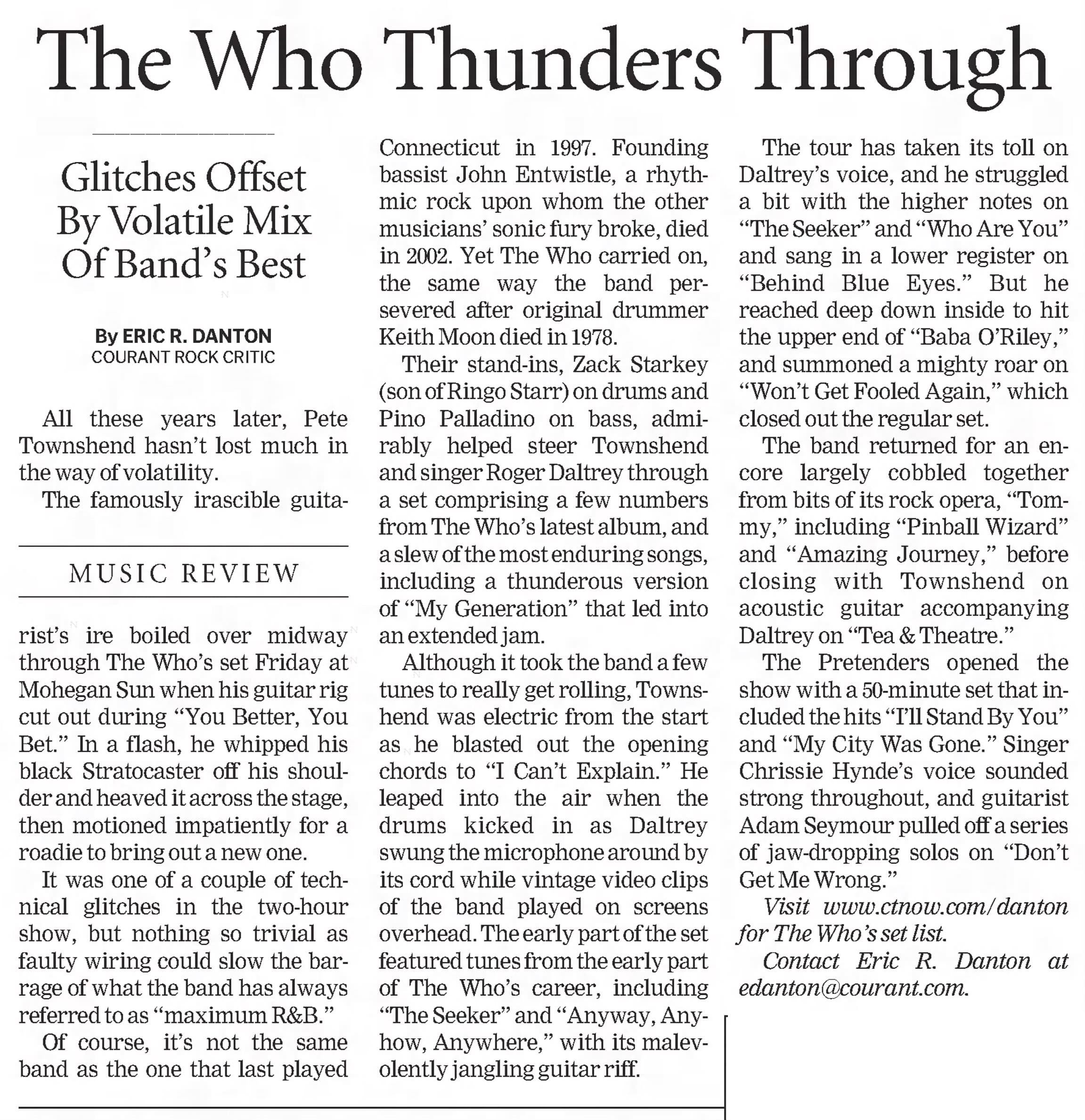 Friday, December 1st, 2006 The Who play at the Mohegan Sun Casino in Uncasville, Connecticut. « 2006-11-29 2006-12-02 » WhoTube Newspapers 2006-12-03-Hartford_Courant 2006-12-03-The_Day 2006-12-04-The_Republican Comments Leave a Reply Cancel replyYou must be logged in to post a comment. This site uses Akismet to reduce spam. Learn how your comment data is processed. Map Venue Mohegan Sun Arena, Uncasville I was there Latitude: 41.491734 Longitude: -72.090917 For more information on The Who’s history and concerts visit our friends www.thewhothismonth.com www.thewholive.com