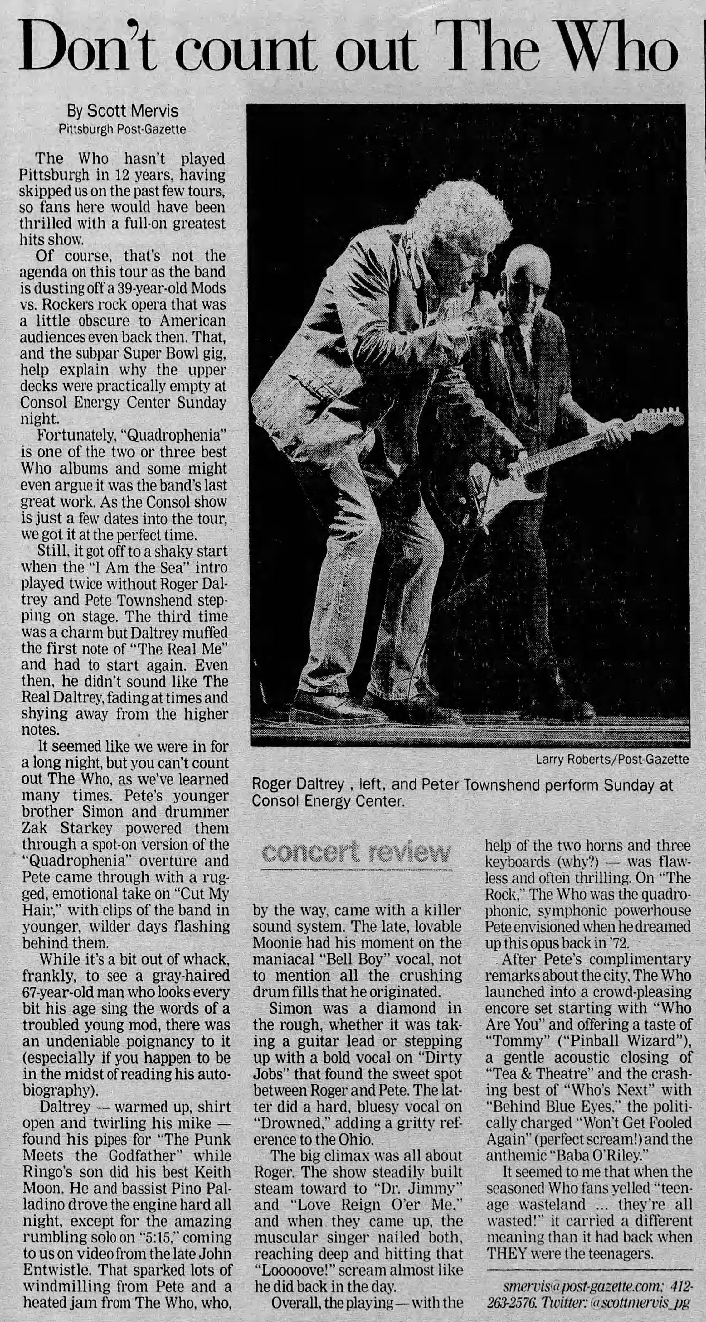 The Who play the Consol Energy Center in Pittsburgh, Pennsylvania