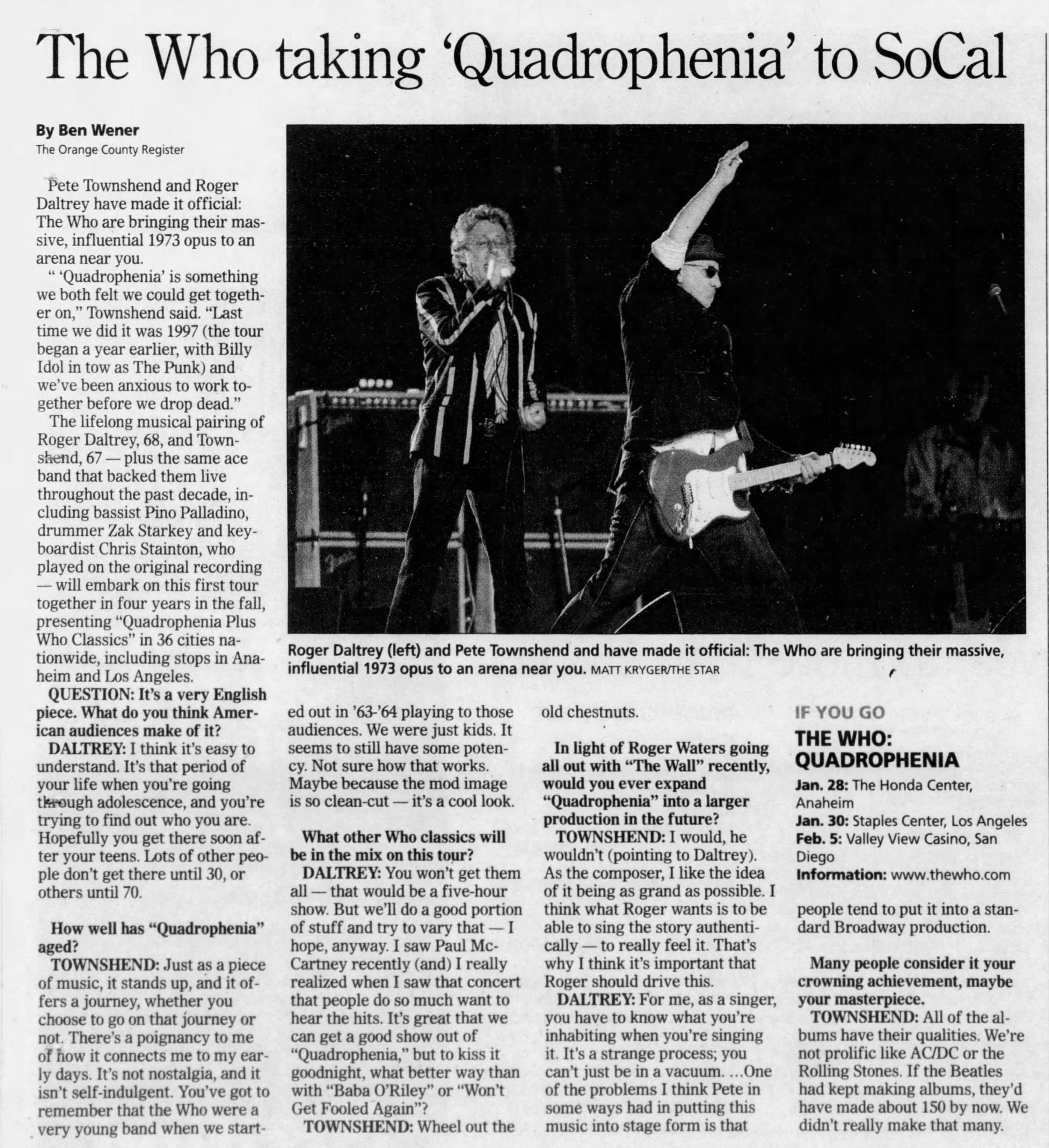 The Who play the Valley View Casino Center in San Diego, California. Due to an injury, Zak Starkey steps down as drummer to be replaced by Scott Devours