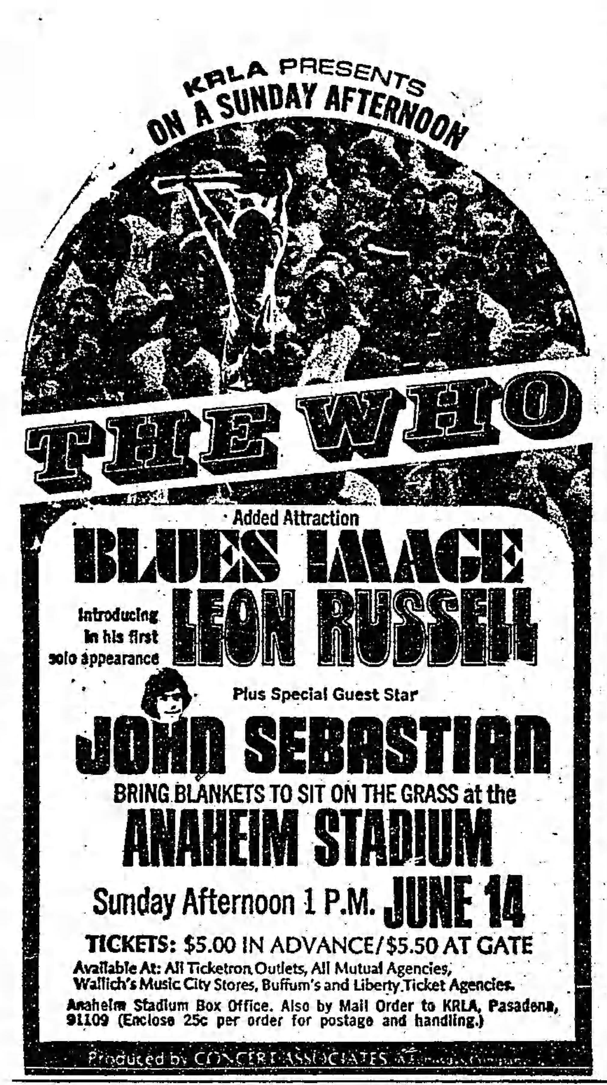 The Who play at the Anaheim Stadium with supporting acts John Sebastian, Blues Image and, in his live premiere as a solo artist, the session pianist Leon Russell