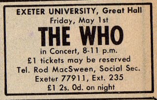 The Who play the Great Hall at the University of Exeter in Exeter, Devonshire