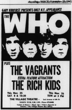 The Who play the first of two nights at The Village Theatre in New York City. The Vagrants, with guitarist Leslie West, and The Rich Kids open for them.