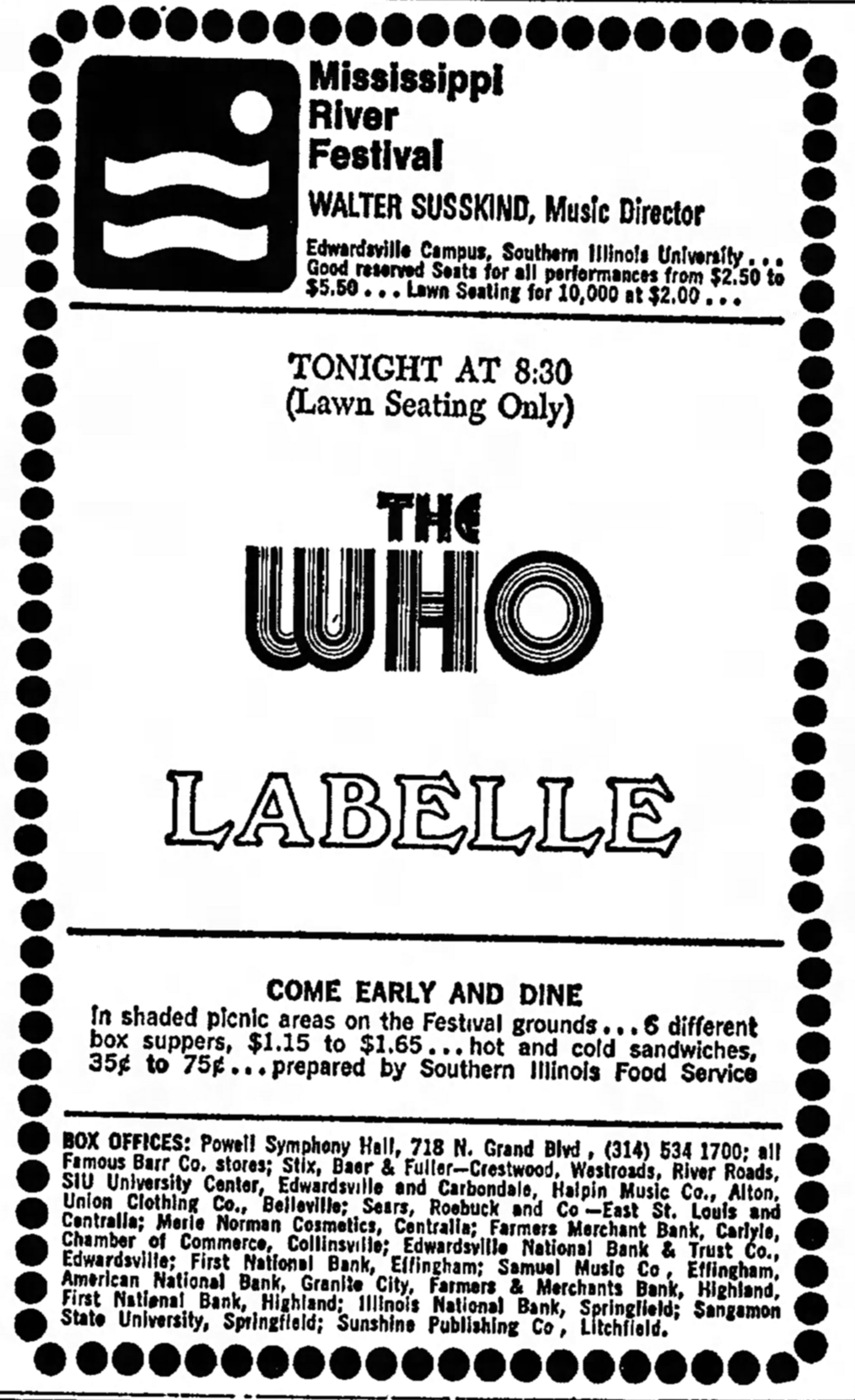 The Who play the Mississippi River Festival at Southern Illinois University in Edwardsville, Illinois