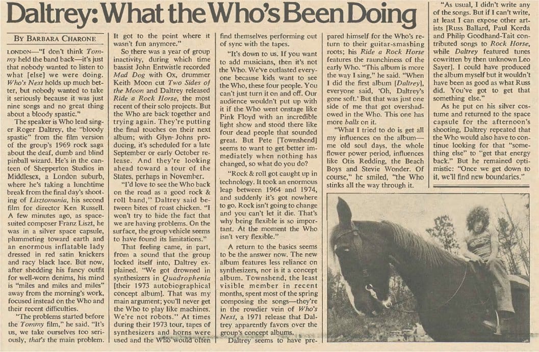 Rolling Stone magazine features an article titled “Daltrey: What the Who’s Been Doing” as well as a review of Roger’s new album “Ride a Rock Horse” Transcript: “I don’t think Tommy held the band back – it’s just that nobody wanted to listen to what [else] we were doing. Who’s Next holds up much… Read More »1975-09-11