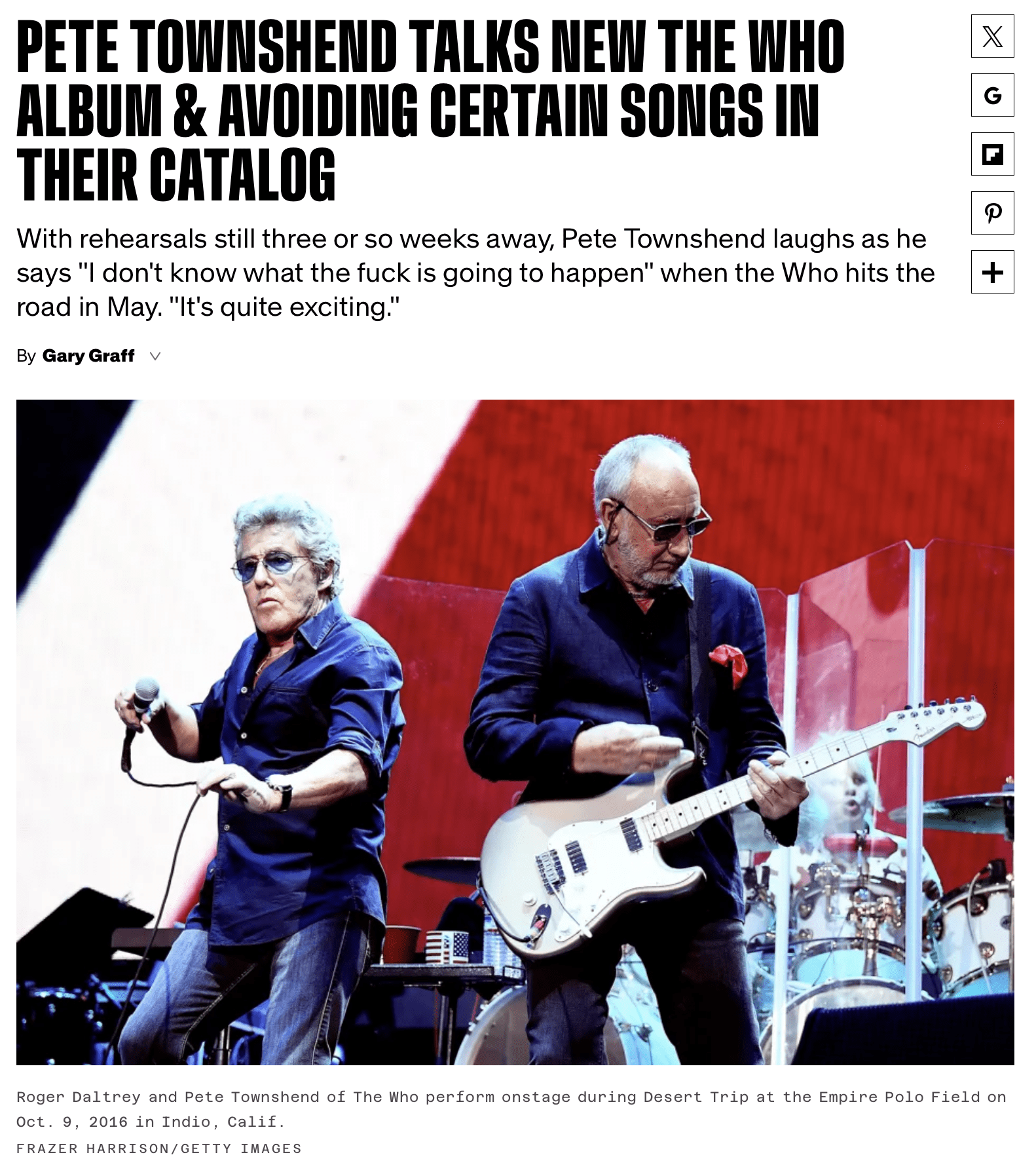 Billboard.com carries an article entitled “Pete Townshend Talks New The Who Album & Avoiding Certain Songs In Their Catalog” by Gary Graff You can read it here