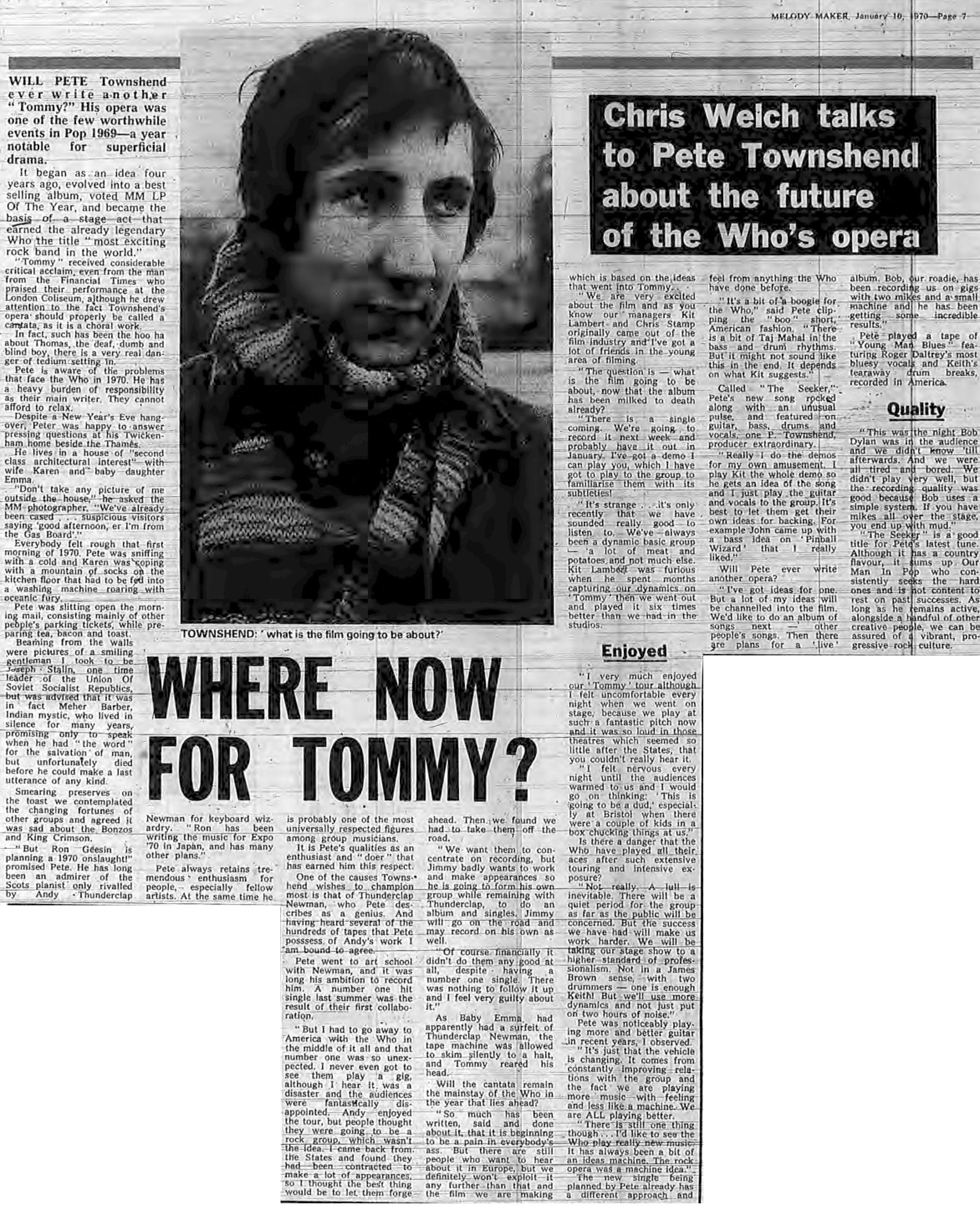 Melody Maker publishes an interview with Pete by Chris Welch. He discusses the future of Tommyand his plans to produce an album by a group formed around his old art school friend Andy Newman.