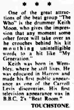 The Harrow Observer calls Keith “One of the great attractions of the beat group ‘The Who’ and says his first television appearance was on “Beat Room”