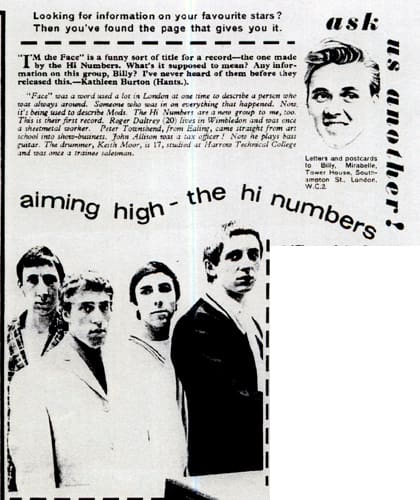 Mirabelle answers questions about the meaning of “Face” in “I’m The Face” and gives a little backstory on The High Numbers in their latest issue. Transcription: Looking for information on your favourite stars? Then you’ve found the page that gives you it. “Im the Face” is a funny sort of title for a record —… Read More »1964-08-22