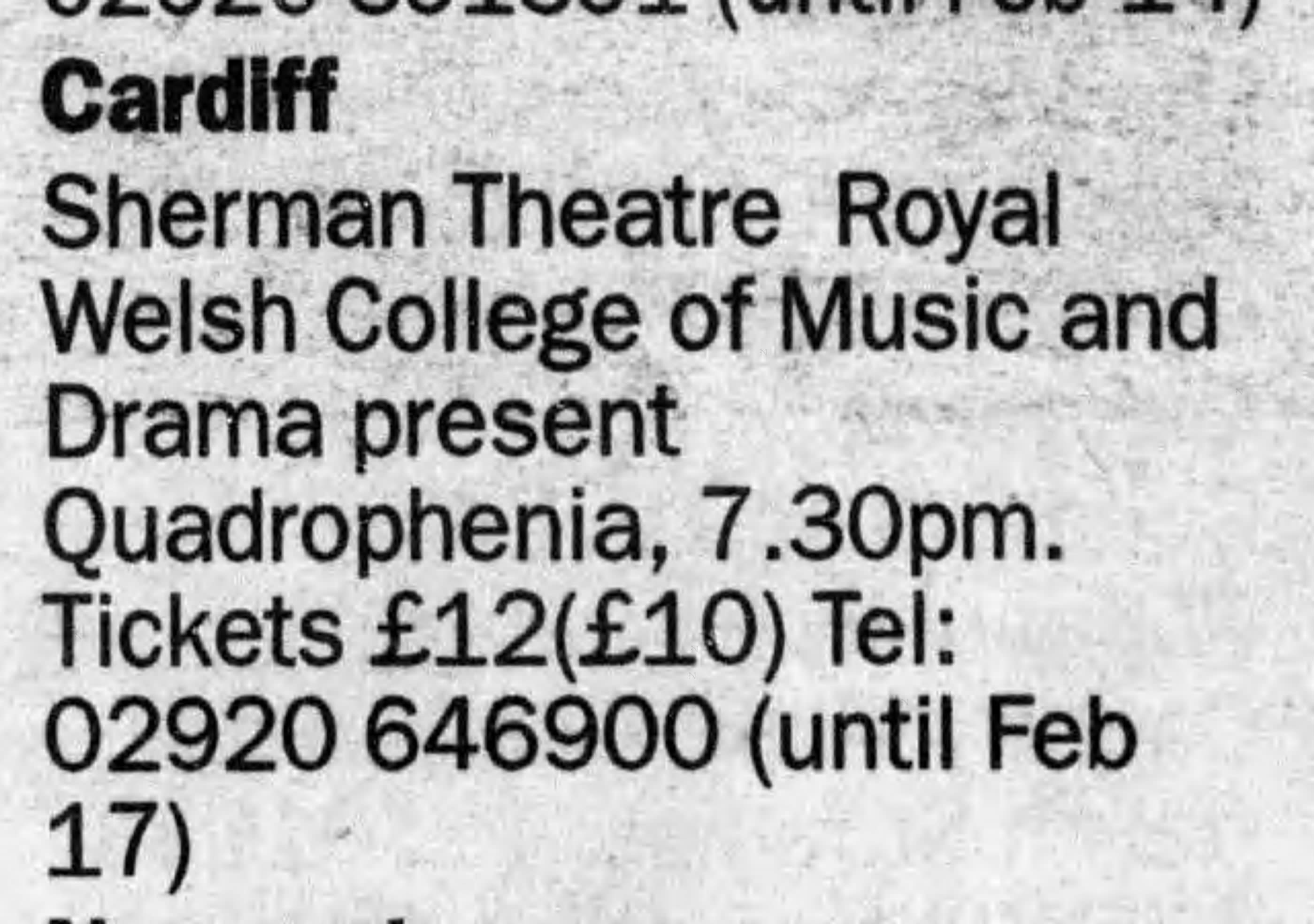 The world premiere of the official stage musical of Quadrophenia is performed by students from the Royal Welsh College of Music and Drama at the Sherman Theatre in Cardiff. Director Tom Critchley, writer Jeff Young and musical director John O’Hara adapted the album under Pete’s guidance. The musical contains no dialogue and fleshes out the… Read More »2007-02-09