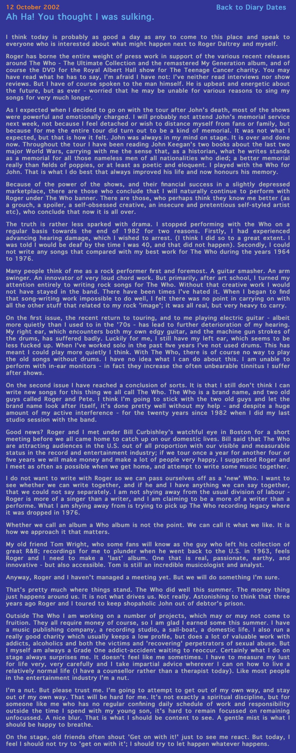 Pete writes a long diary entry on the future of The Who