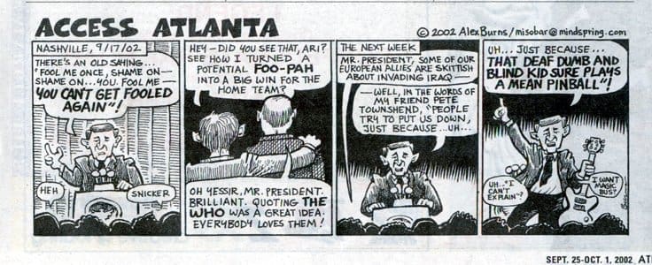 President Bush appears to quote The Who in a speech at the East Literature Magnet School in Nashville, Tennessee. “There’s an old saying in Tennessee — I know it’s in Texas, probably in Tennessee — that says, fool me once, shame on — shame on you. Fool me — you can’t get fooled again.” The… Read More »2002-09-17