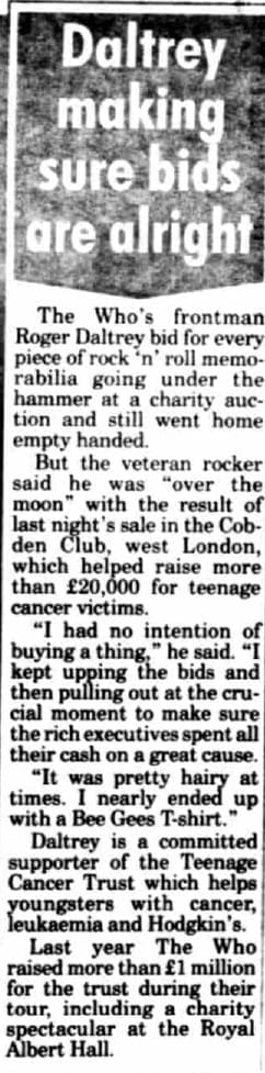 Roger Daltrey bids on every item in a rock ‘n’ roll auction at the Cobden Club in Kensal Town