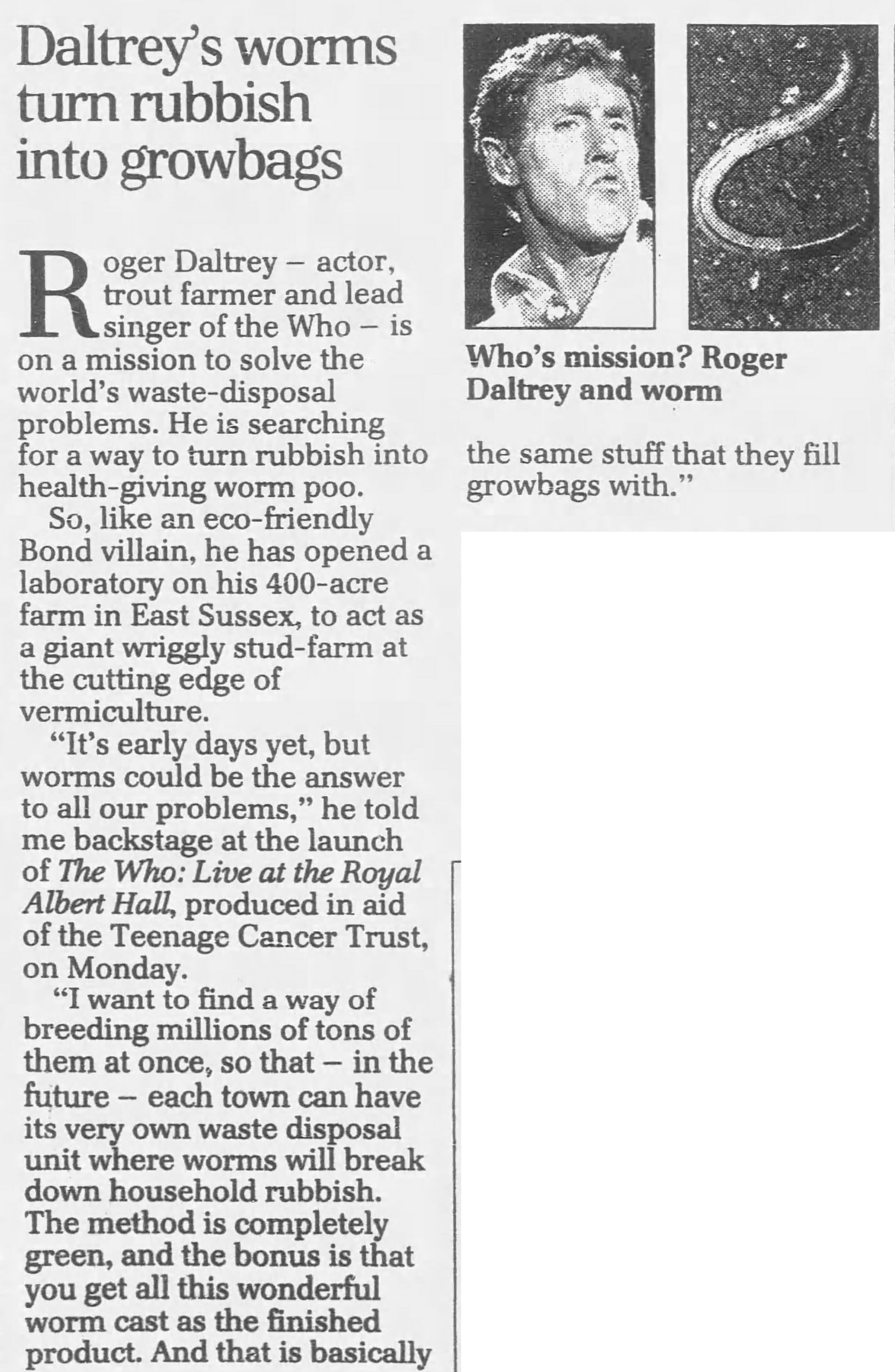 Roger tells the press he has started a worm farm at his 400-acre farm in Etchingham, East Sussex to sell for processing landfills.