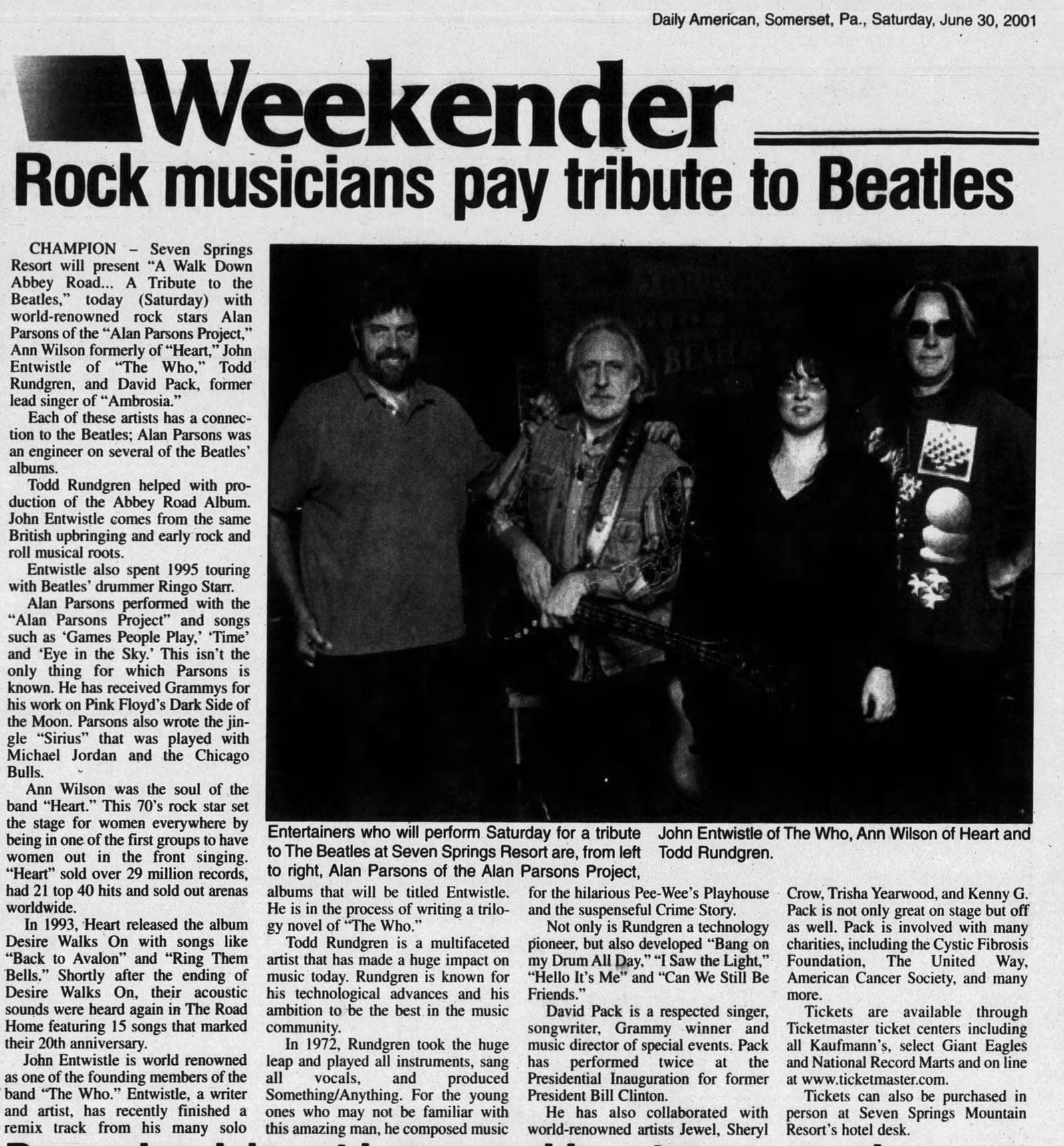 “A Walk Down Abbey Road: A Tribute To The Beatles.” featuring John play at the Seven Springs Mountain Resort in Champion, Pennsylvania