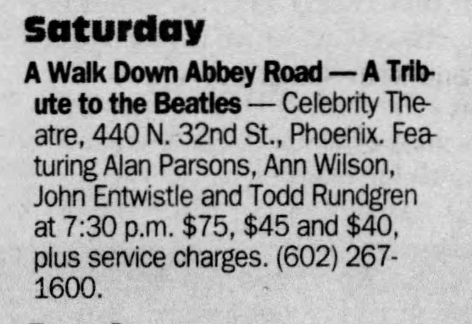 “A Walk Down Abbey Road: A Tribute To The Beatles.” featuring John play at The Celebrity Theatre in Phoenix, Arizona