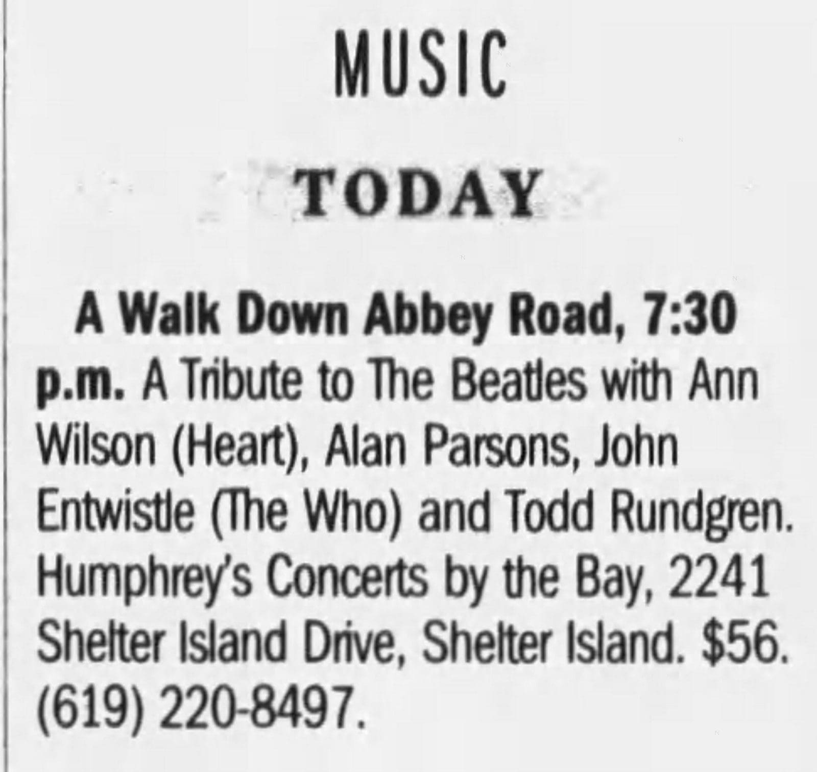 “A Walk Down Abbey Road: A Tribute To The Beatles.” featuring John play at Humphrey’s Concerts By The Bay in San Diego, California