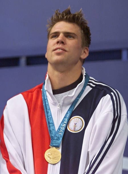 Gary Hall, U.S. swimming relay team member, wins the Gold at the Summer Olympics in Sydney.