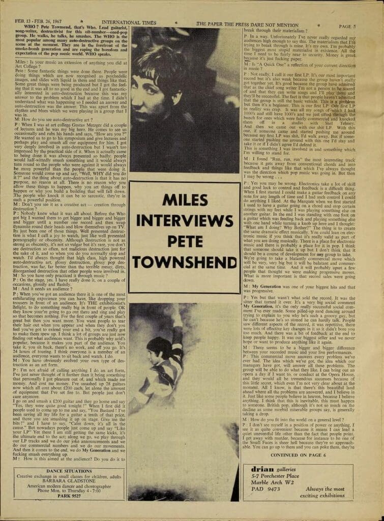 The first half of an interview with Pete in International Times is published. The second half is published on the 27th. In it he discusses the art of auto-destruction and his ability to make social comments through pop songs.