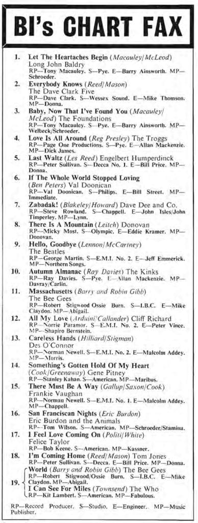 Beat Instrumental carries The Keith Moon Column as well as a brief article entitled "Transport Problem For The Who". I Can See For Miles is #19 in the "BI's Chart Fax"