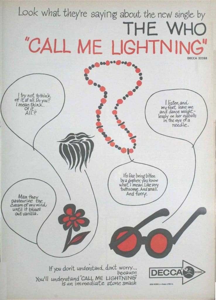 Billboard features a full page ad for Call Me Lightning. They also report that The Who have recorded a commercial for Sunn Musical Equipment Co. that will be distributed as a single at Sunn dealerships.