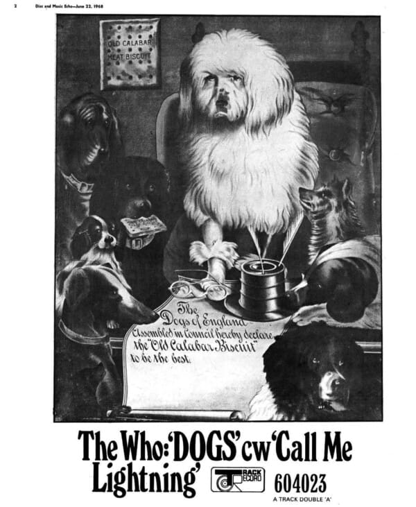 Saturday, June 22nd, 1968 Disc & Music Echo carries a full page ad for Dogs Bookmark this event « 1968-06-22 1968-06-22 » Comments Leave a Reply Cancel replyYou must be logged in to post a comment. This site uses Akismet to reduce spam. Learn how your comment data is processed. For more information on The Who’s history and concerts visit our friends www.thewhothismonth.com www.thewholive.com